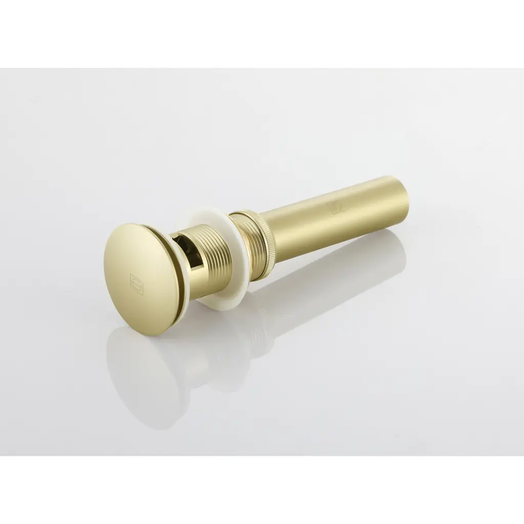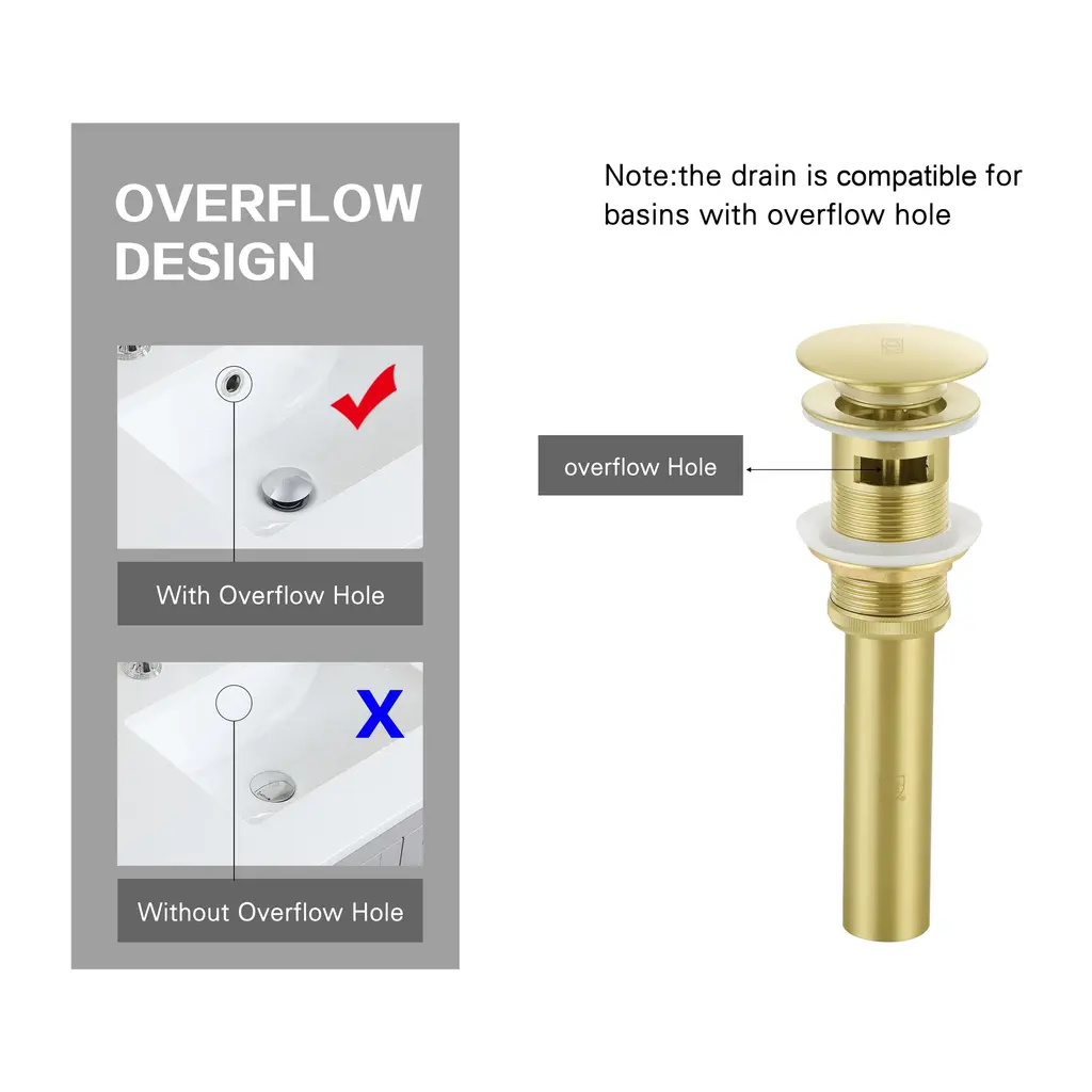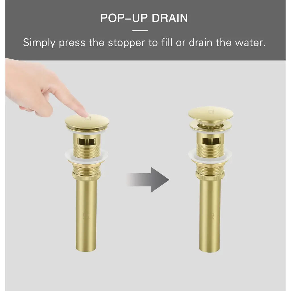 Enhance your bathroom with our Pop-Up Drain with Overflow Hole, expertly designed to offer a perfect blend of functionality, durability, and style. Available in four elegant finishes—Brushed Gold, Polished Chrome, Brushed Nickel, and Matte Black—this drain complements any vanity sink with an overflow. Crafted from a high-quality combination of plastic, stainless steel, and solid brass, it provides outstanding durability and meets cUPC certification standards for superior quality. The pop-up design features a convenient push-button mechanism for effortless operation. Engineered to resist rust and corrosion, this drain retains its sleek appearance and reliable performance over time. Upgrade your space with this chic and practical pop-up drain.