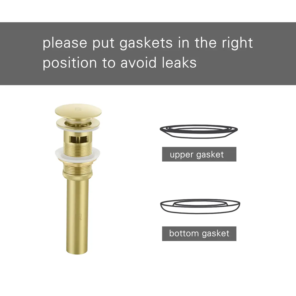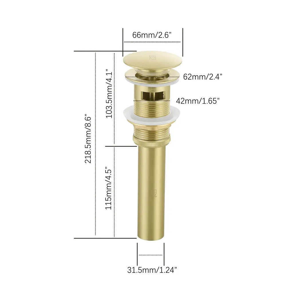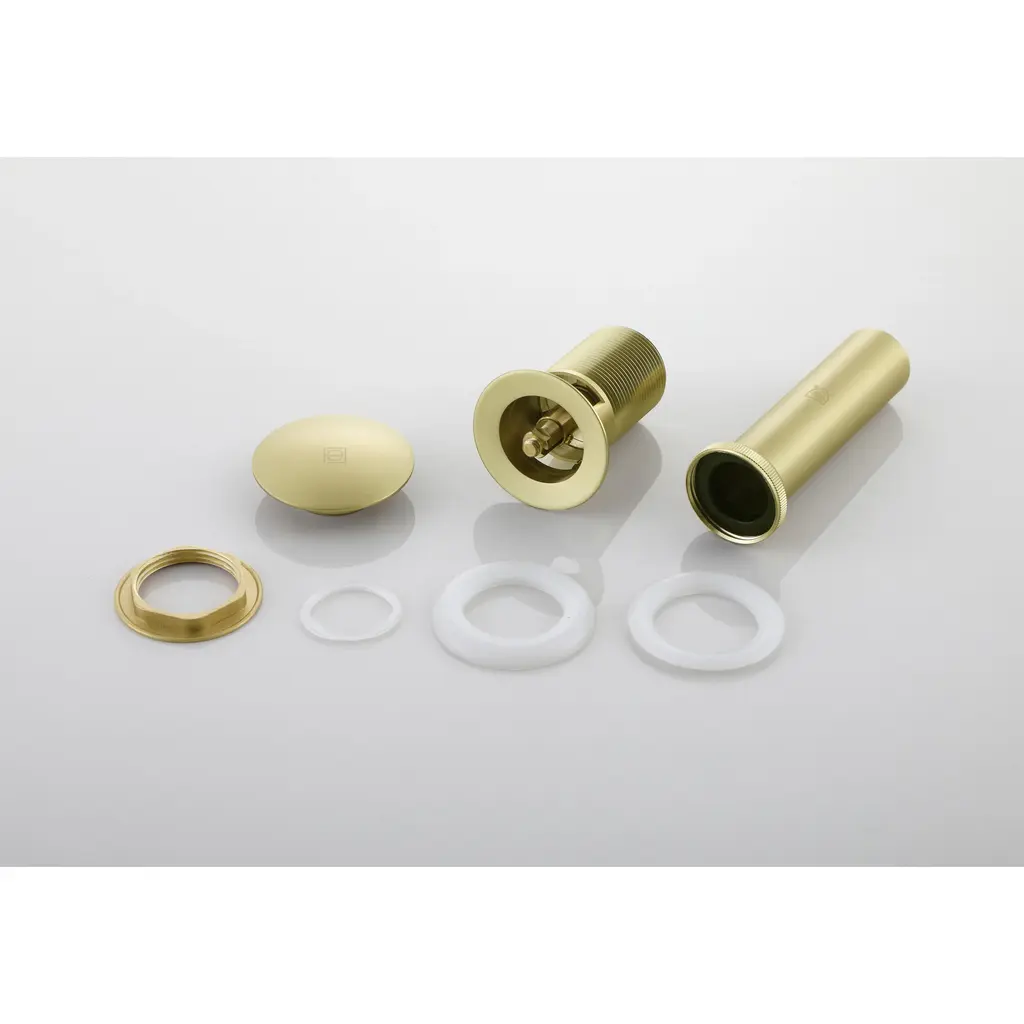 Enhance your bathroom with our Pop-Up Drain with Overflow Hole, expertly designed to offer a perfect blend of functionality, durability, and style. Available in four elegant finishes—Brushed Gold, Polished Chrome, Brushed Nickel, and Matte Black—this drain complements any vanity sink with an overflow. Crafted from a high-quality combination of plastic, stainless steel, and solid brass, it provides outstanding durability and meets cUPC certification standards for superior quality. The pop-up design features a convenient push-button mechanism for effortless operation. Engineered to resist rust and corrosion, this drain retains its sleek appearance and reliable performance over time. Upgrade your space with this chic and practical pop-up drain.