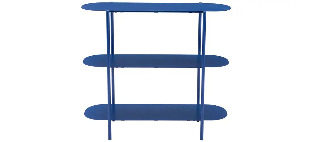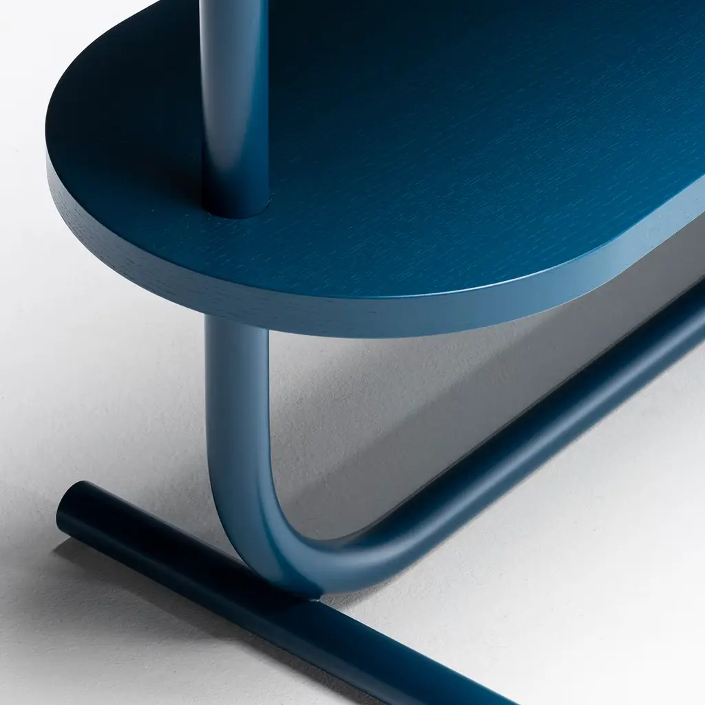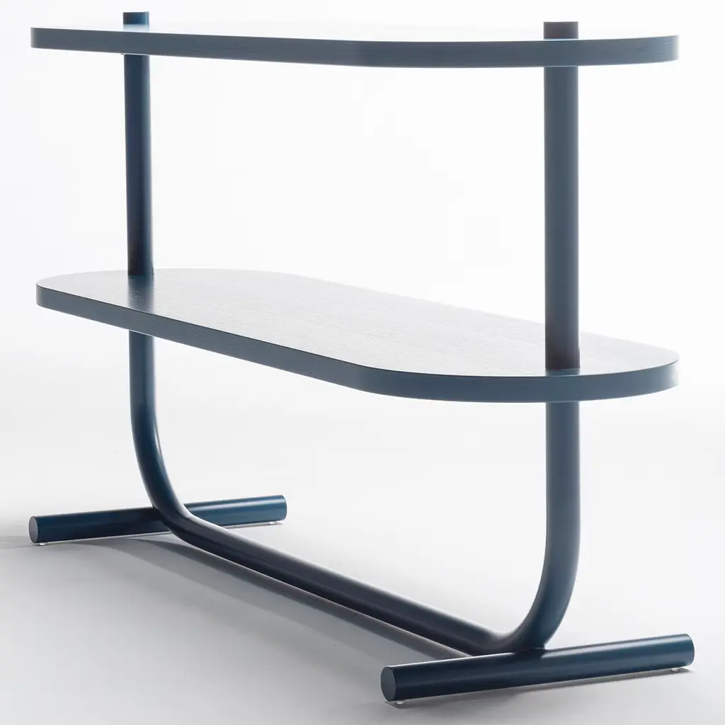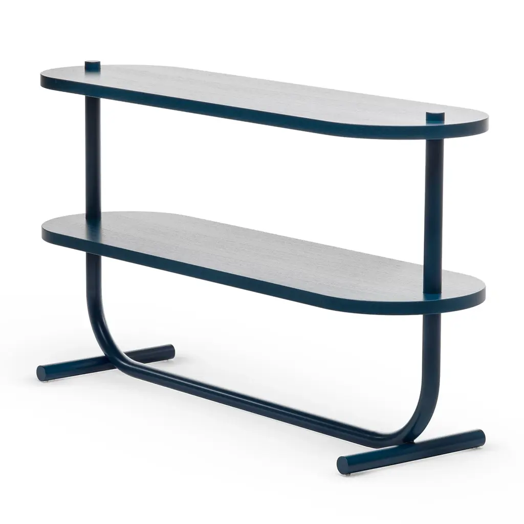 Complementing modern entryways with this console might evoke ocean waters, with their intense blue hues and tireless waves. Coherently powder-coated in ocean blue to immediately reveal its inspiration, the design offers two tops veneered in matte-lacquered ash pierced by the cylindrical steel frame and raised on horizontally-laying cylindrical feet.