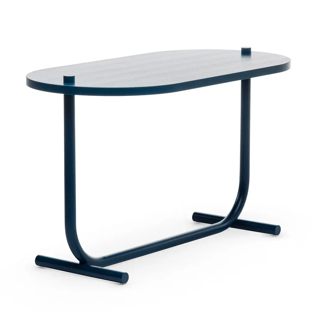 An exquisite addition to modern and contemporary homes wanting to evoke the intensity of ocean depths in their hallways or entryways, this console is an exercise in gentle curves. The single cylindrical element in ocean blue-powder-coated steel - bent to be steadily raised on the matching cylindrical feet - pierces the matte lacquered ash-veneered top near the rounded sides.