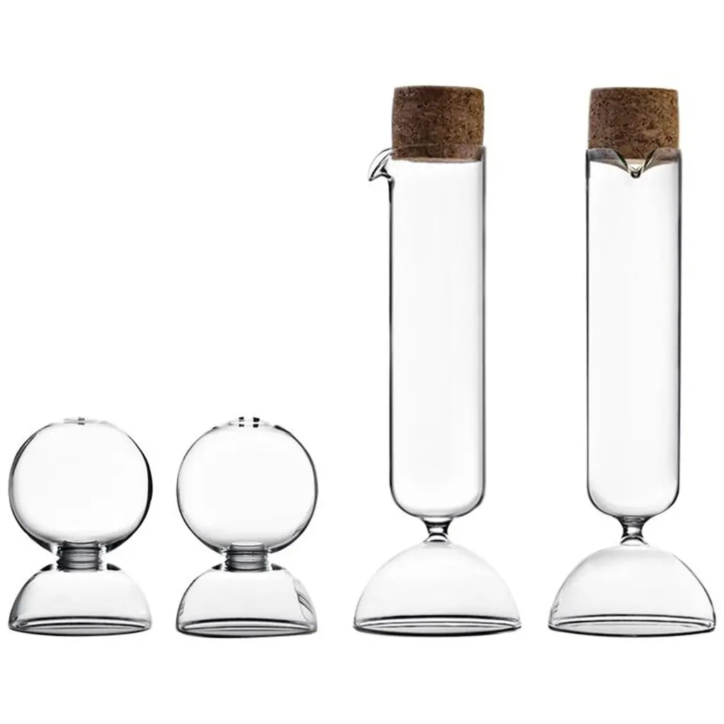 Bubble, designed by Gordon Guillaumier, is an oil and vinegar dispenser set made in transparent blown glass with cork cap.