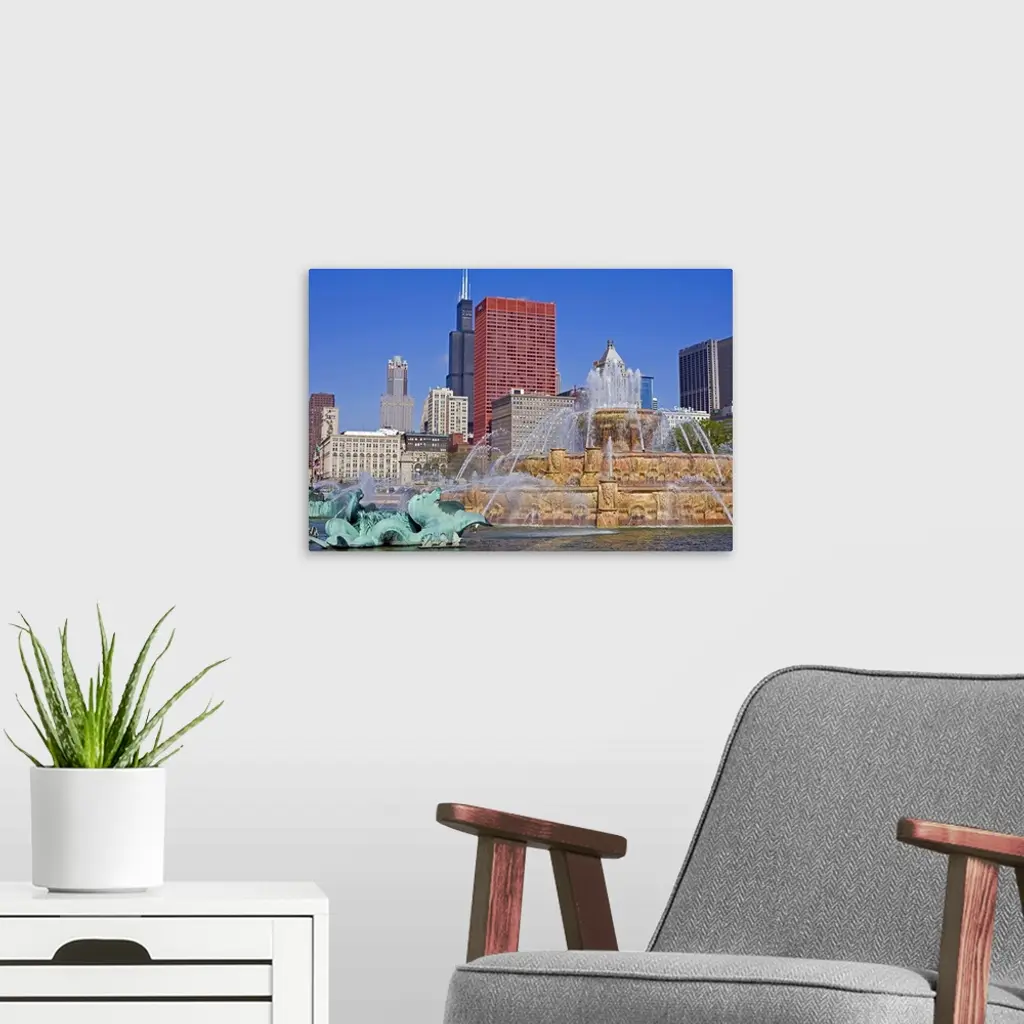 Buckingham Fountain in Grant Park with Sears Tower, Chicago, Illinois, USA wall art for home and office decor. Discover canvas art prints, photos, mural, big canvas art and framed wall art in GreatBigCanvas.com's varied collections.