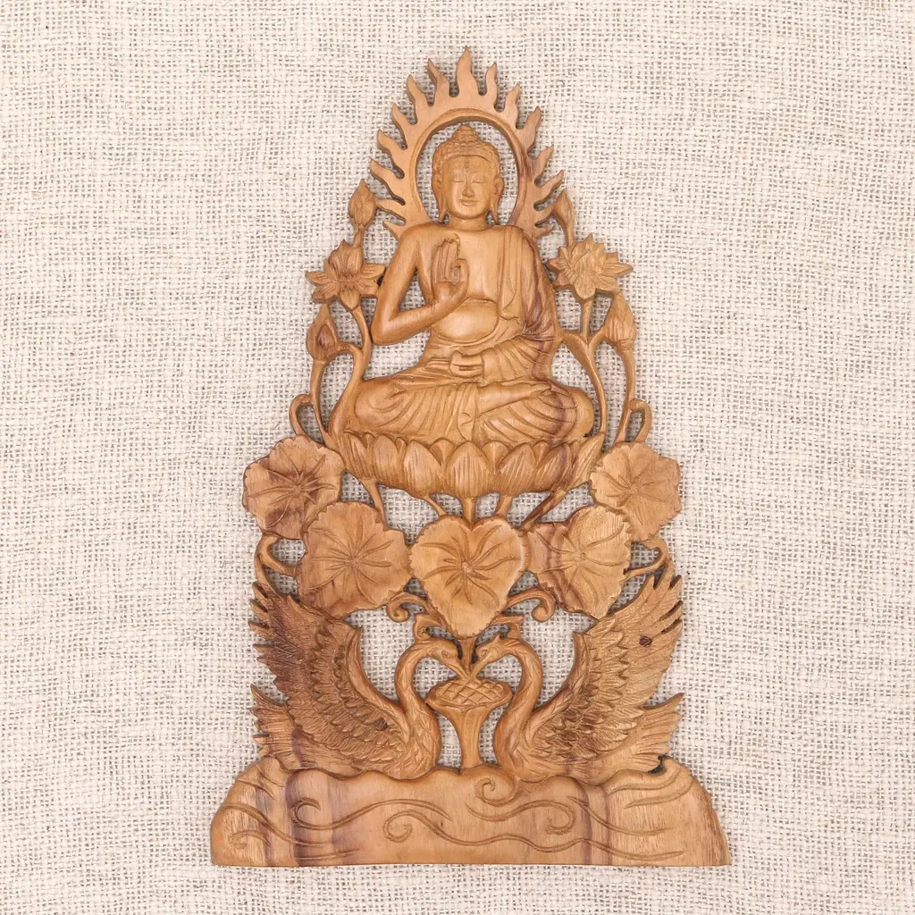 Seated comfortably atop a lotus blossom, this smiling Buddha displays the vitarka mudra or teaching gesture. Supported by the outstretched wings of a pair of swans, the pose symbolizes the transmission of knowledge and insight, gained only after the achievement of enlightenment. Hand carved from suar wood native to Bali, this relief panel is presented by Eka.