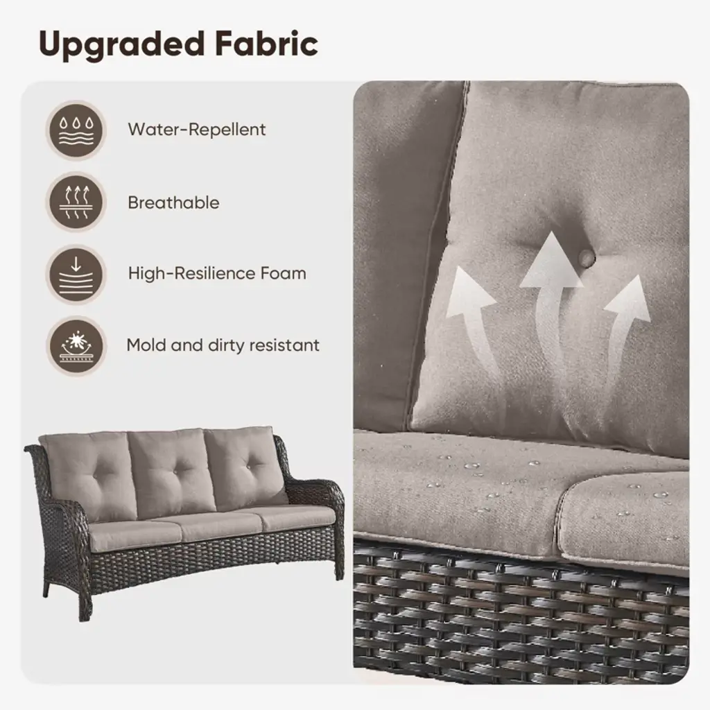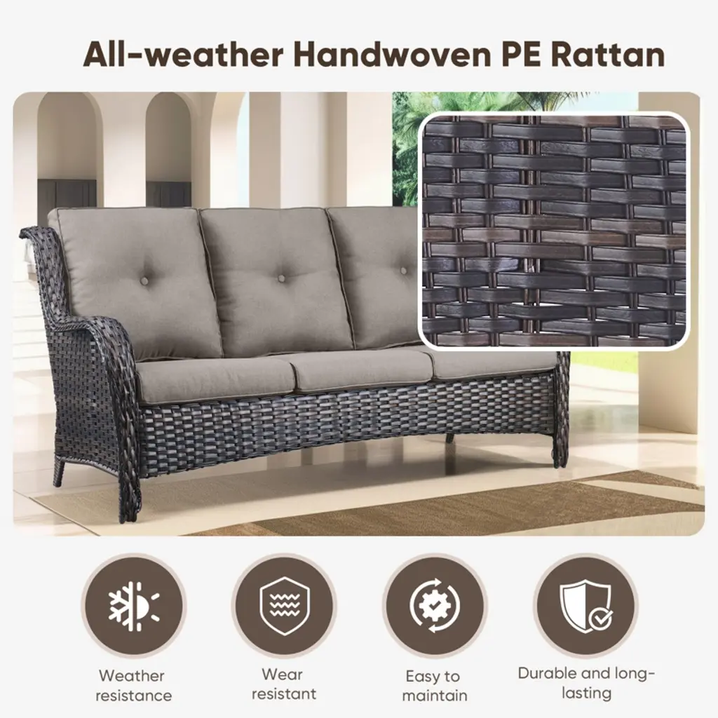 Transform your outdoor space with the Buenhomino All-Weather Wicker Patio Conversation Set! This 4-piece wicker patio furniture set includes a sofa couch, two patio wicker chairs, and a 46inch tempered glass table, all designed for ultimate comfort and durability. Featuring plush 4" cushions, weather-resistant PE wicker, and a rust-proof frame, it's perfect for poolside lounging, garden gatherings, or balcony relaxation. Easy to assemble & low maintenance, create your dream outdoor retreat today!