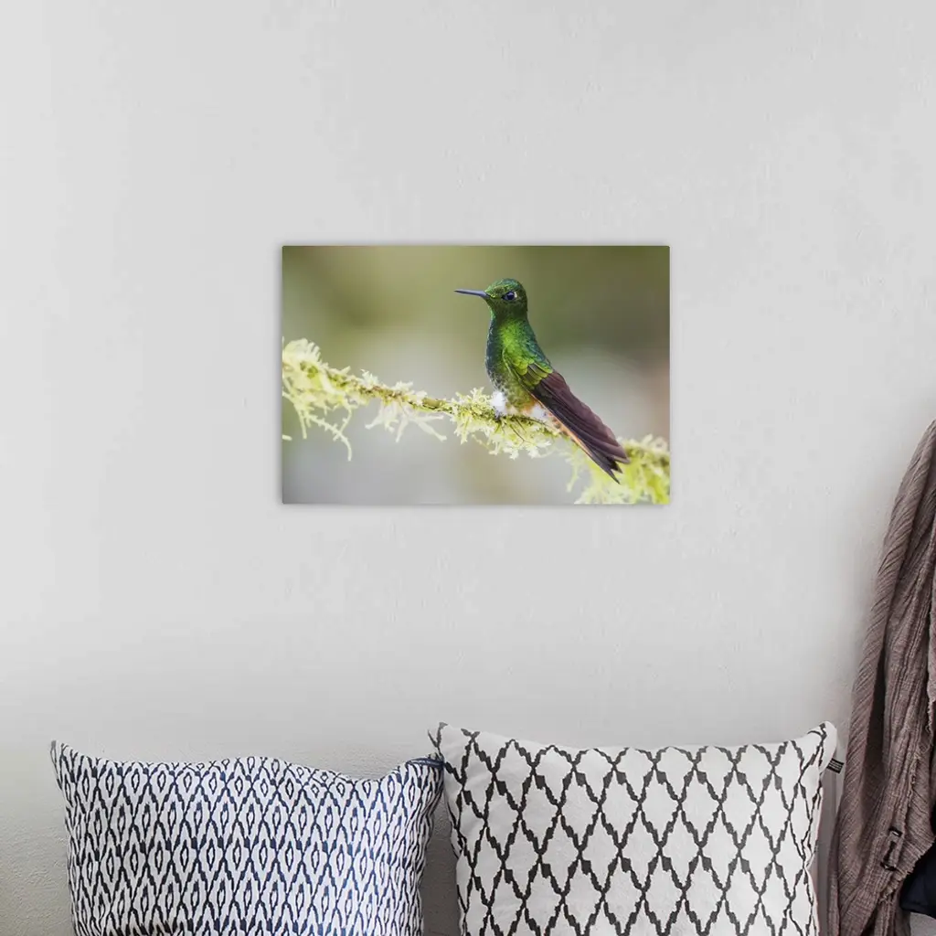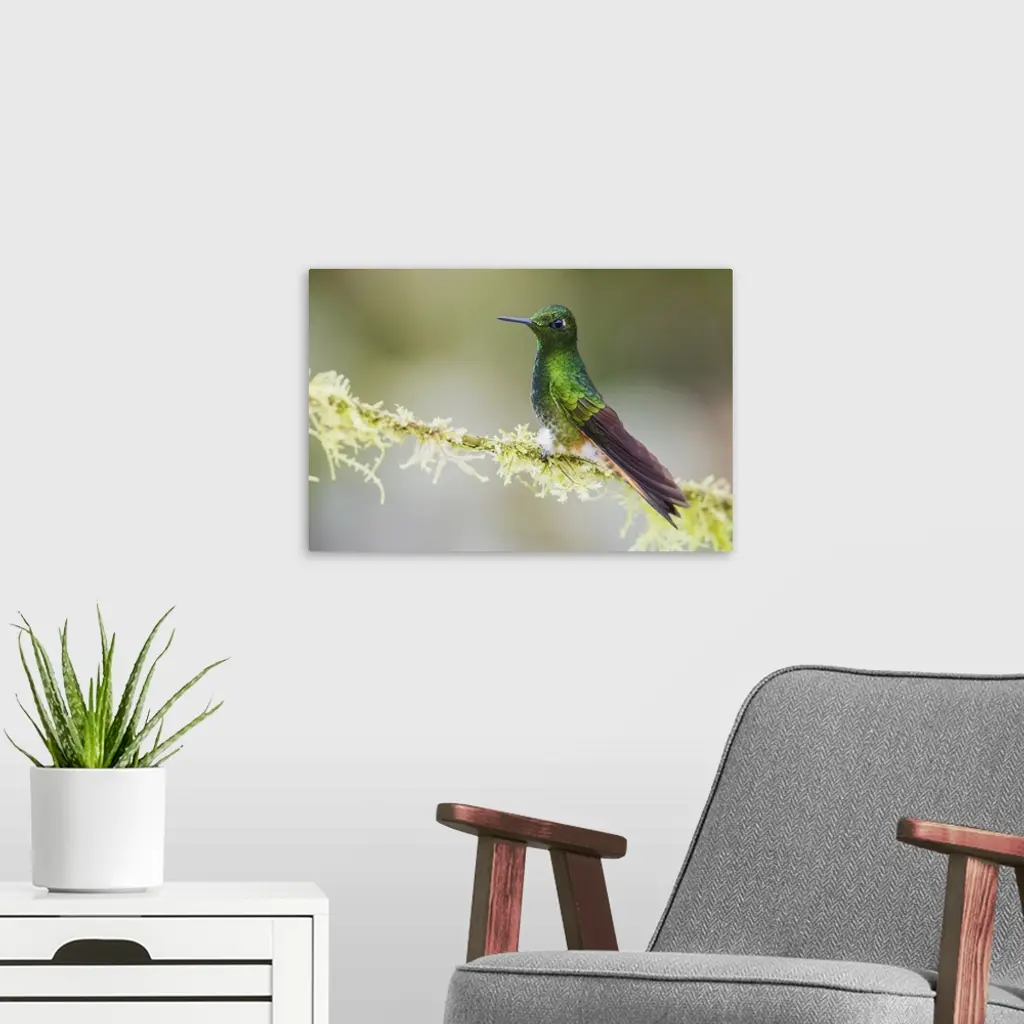 Buff-Tailed Coronet Hummingbird On Mossy Perch, Cloud Forest, Ecuador