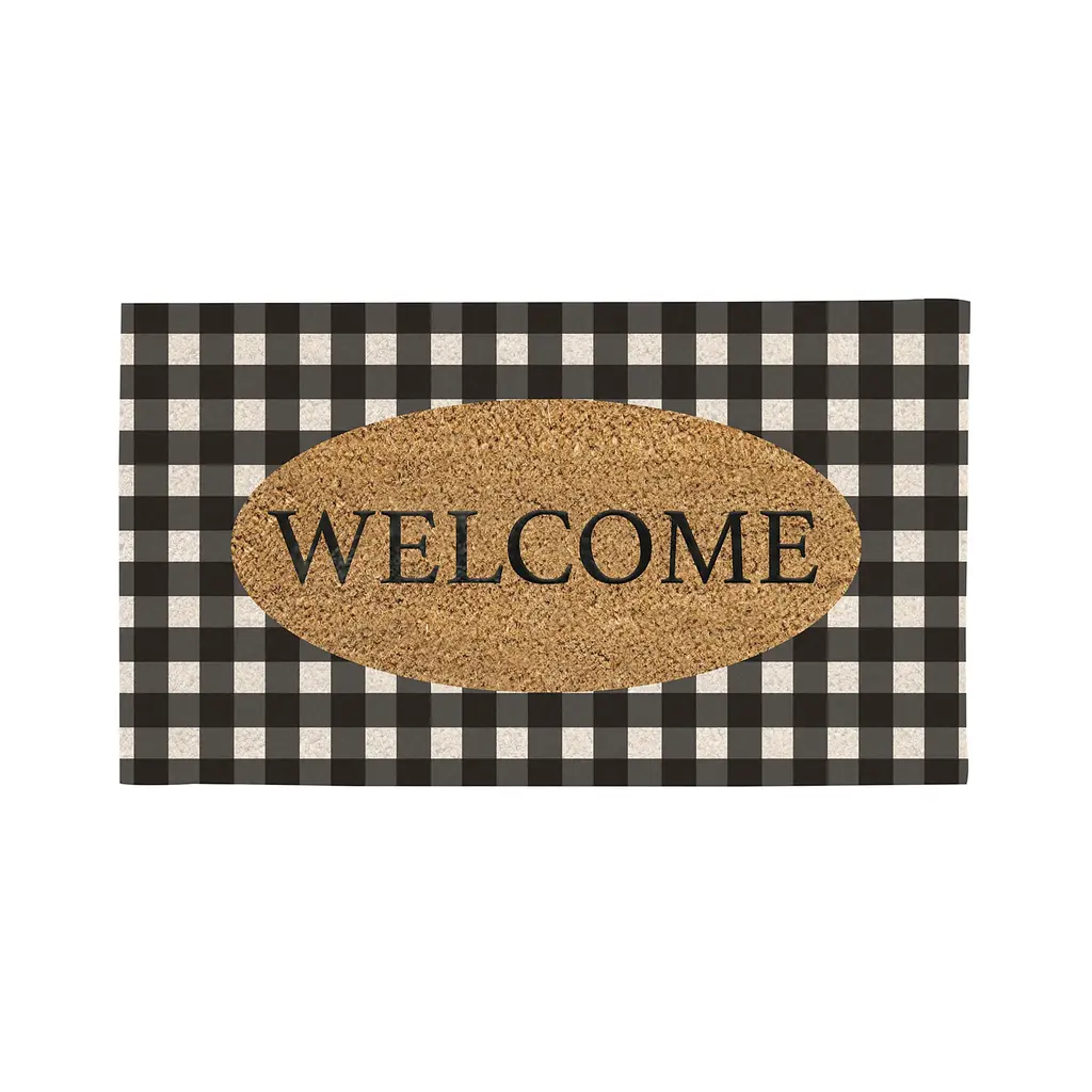 Effortlessly spruce up your front porch or side entryway with this delightful decor piece that helps to keep your floors clean. With a buffalo check border and welcoming message, this mat will greet your guests in style. Crafted from all-natural and renewable coco husk fiber, our charming welcome mat is an eco-friendly solution with good looks. The mat features a recycled rubber backing that provides stability for a non-slip grip. Incredibly durable and long-lasting, this mat is ideal for high-traffic entryways because it traps dirt and debris to prevent messes from being tracked into your house.