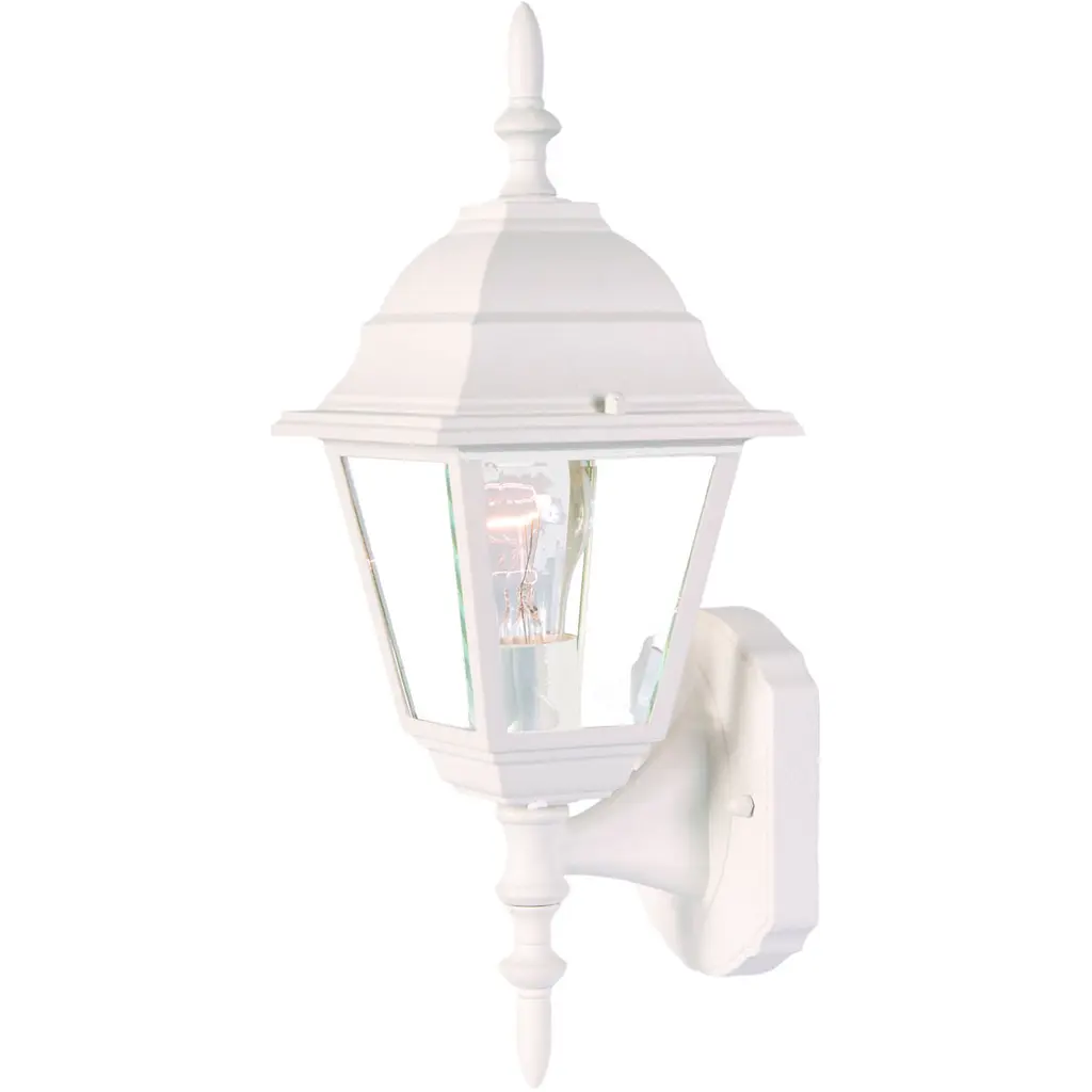 The Builder's Choice collection 1-light wall-mounted lantern is made of cast aluminum. This material is a good choice for exterior lighting since it does not rust and resists corrosion. This is one of our most affordably priced fixtures. Complementing its clean design, this lantern features clear beveled glass panes.