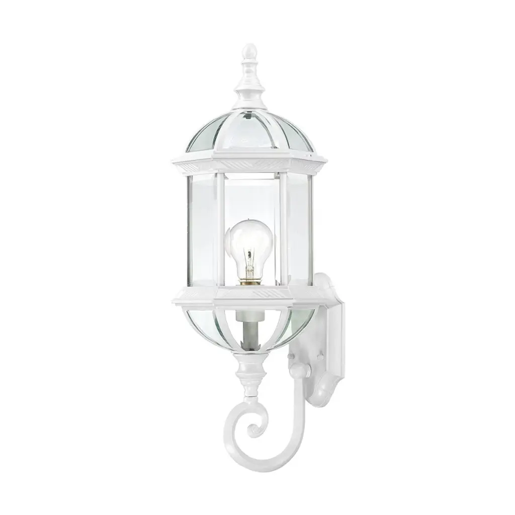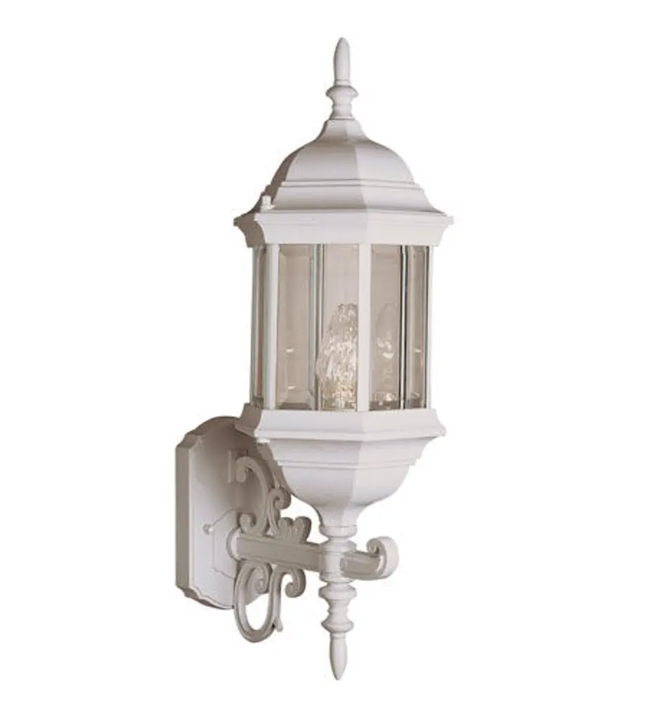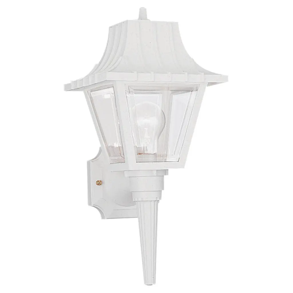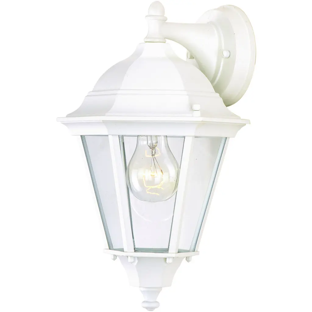 The Builder's Choice collection 1-light wall-mounted lantern is made of cast aluminum. This material is a good choice for exterior lighting since it does not rust and resists corrosion. This is one of our most affordably priced fixtures. Complementing its clean design, this lantern features clear beveled glass panes.
