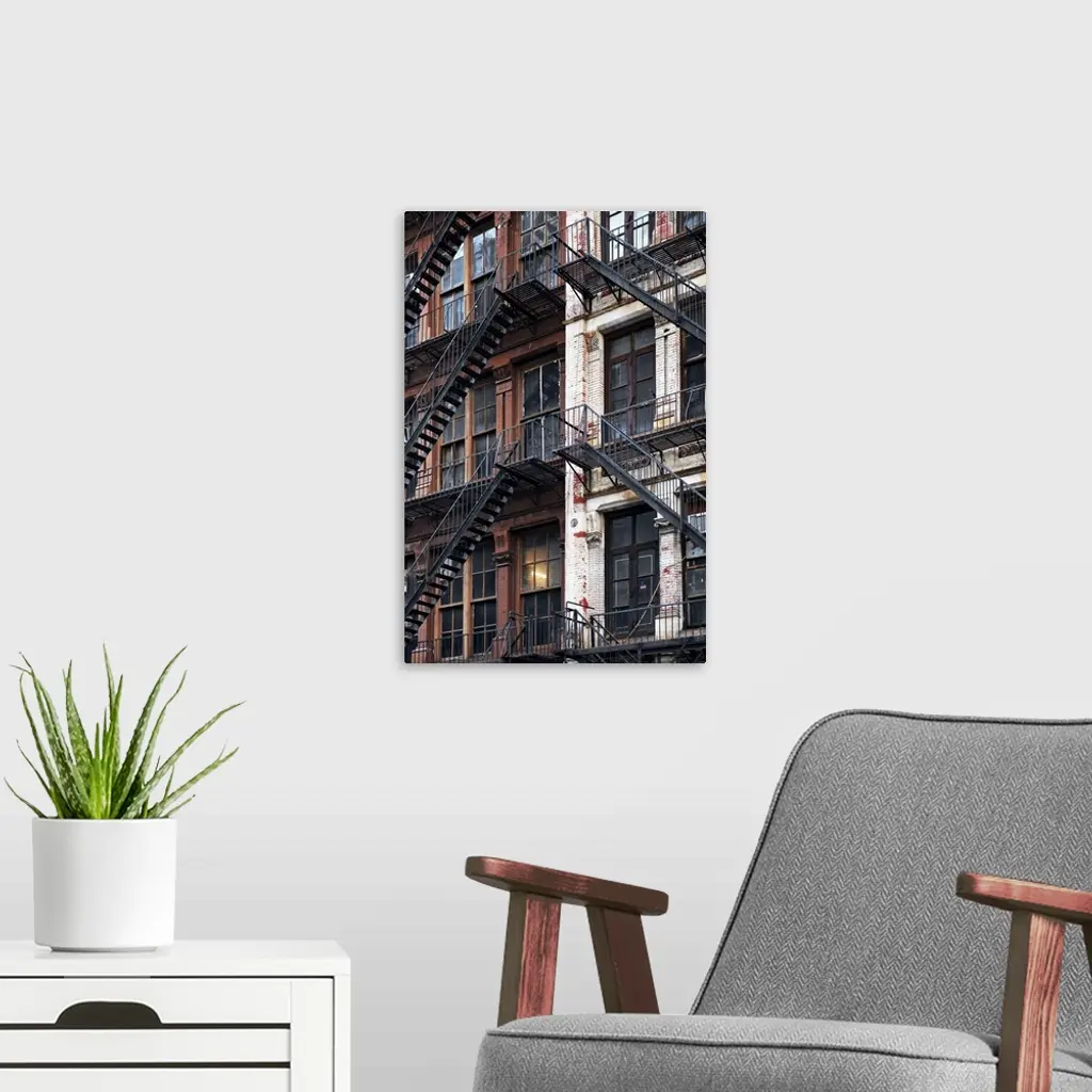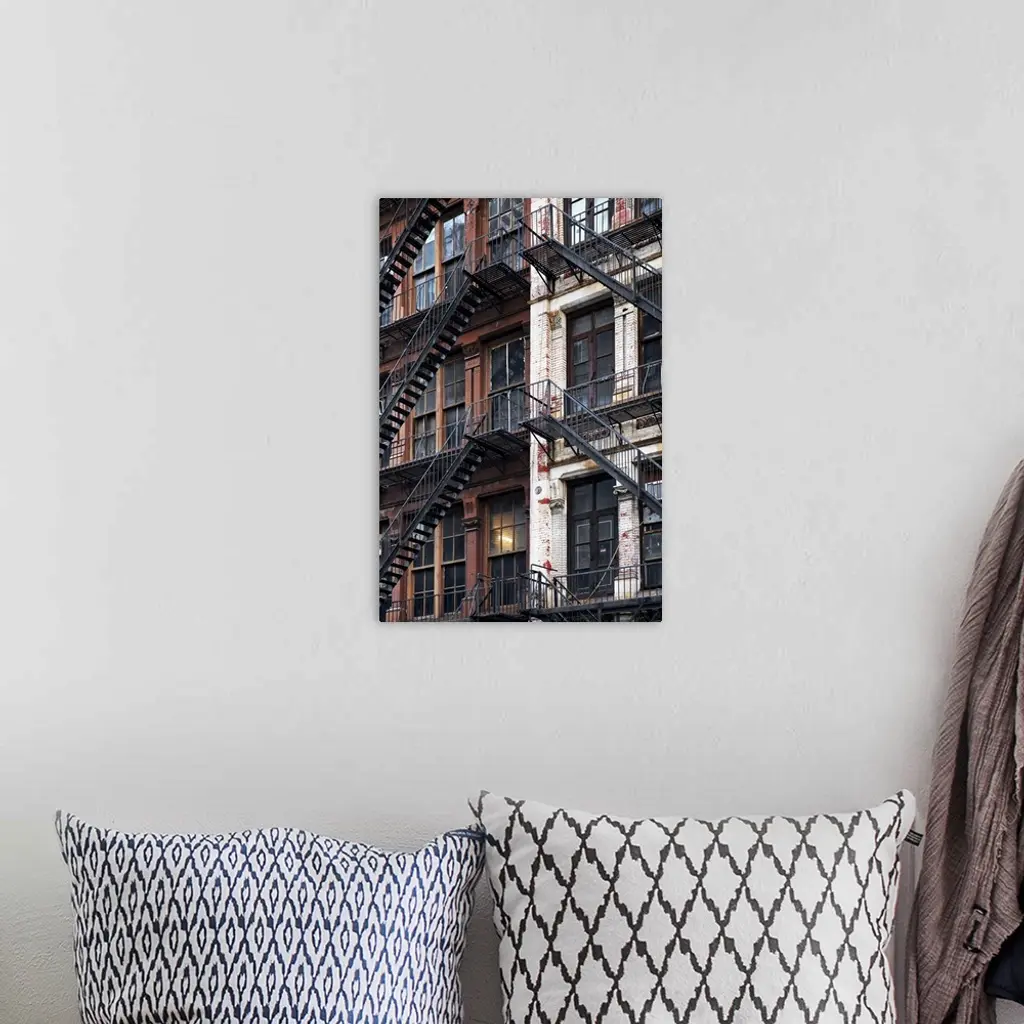 Criss-crossing fire escapes create an abstract image on the sides of a New York building.