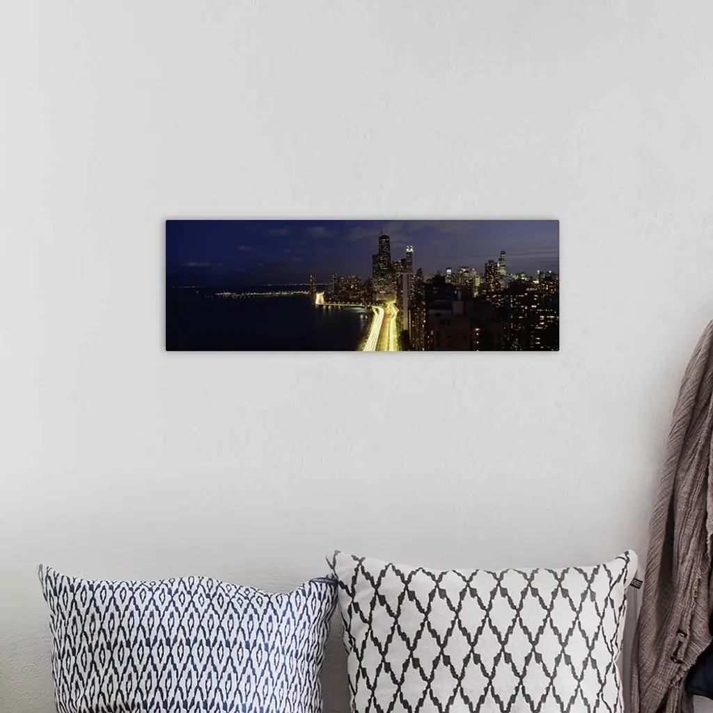 Buildings along a lake lit up at night, Lakeshore Drive, Navy Pier, Lake Michigan, Chicago, Cook County, Illinois, wall art for home and office decor. Discover canvas art prints, photos, mural, big canvas art and framed wall art in GreatBigCanvas.com's varied collections.