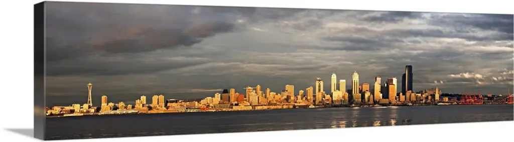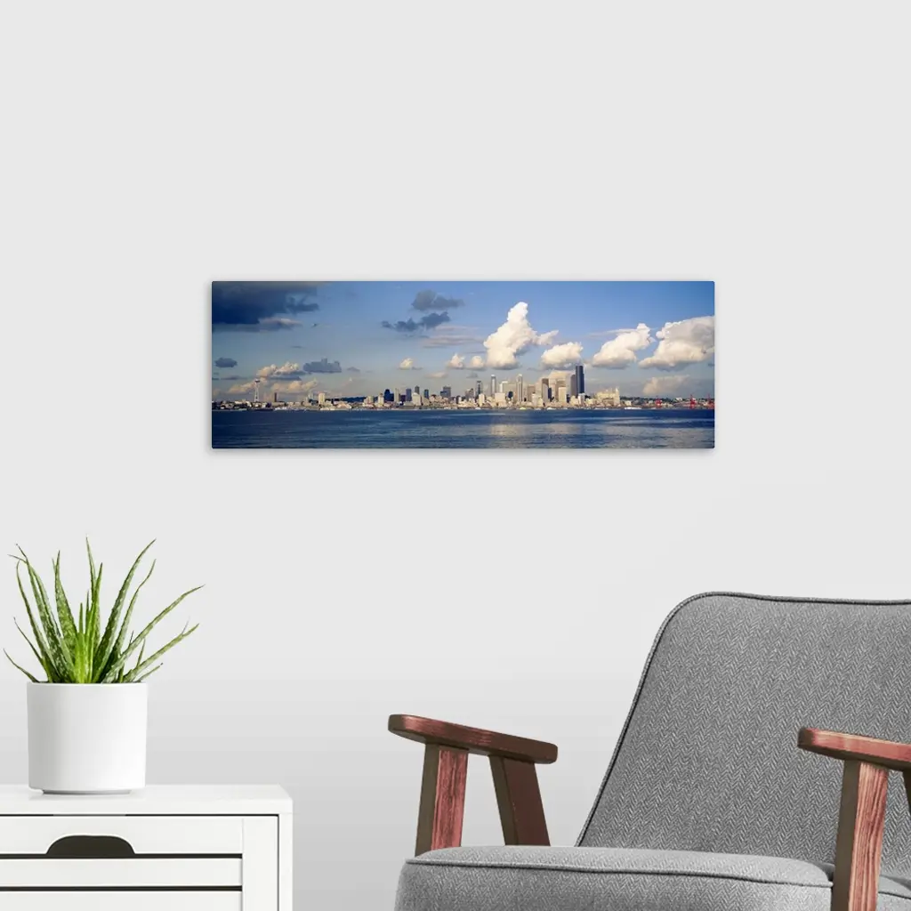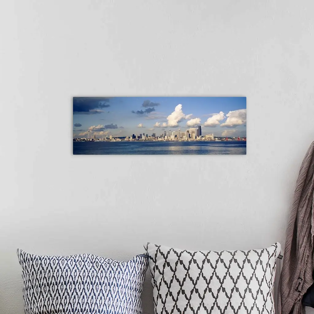Horizontal photograph on a large wall hanging of the Seattle skyline in the distance, Elliot Bay in the foreground, in Washington.