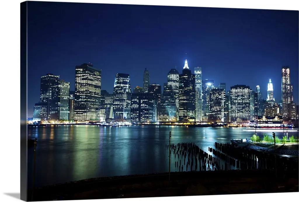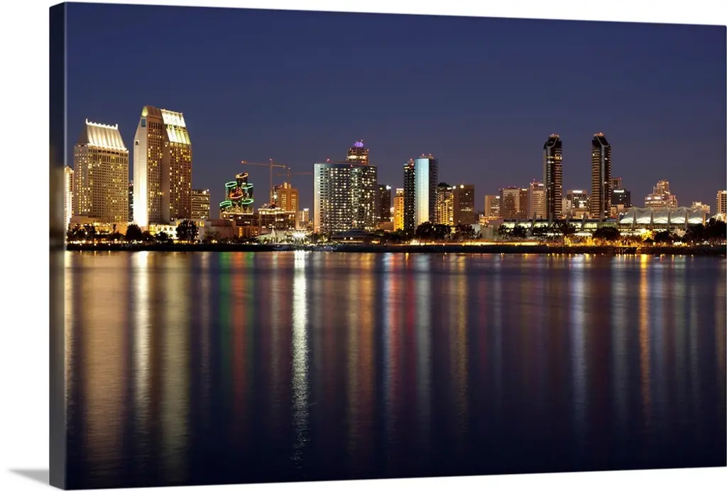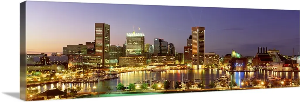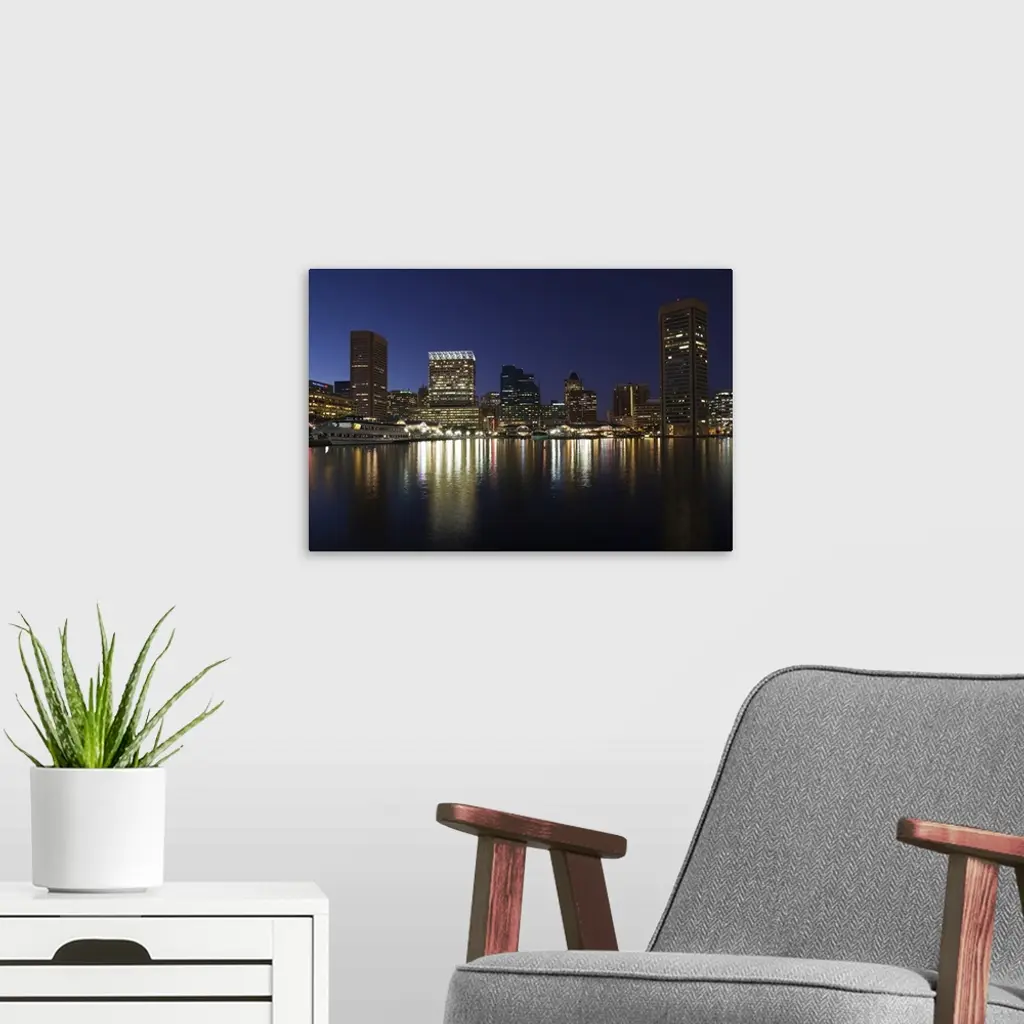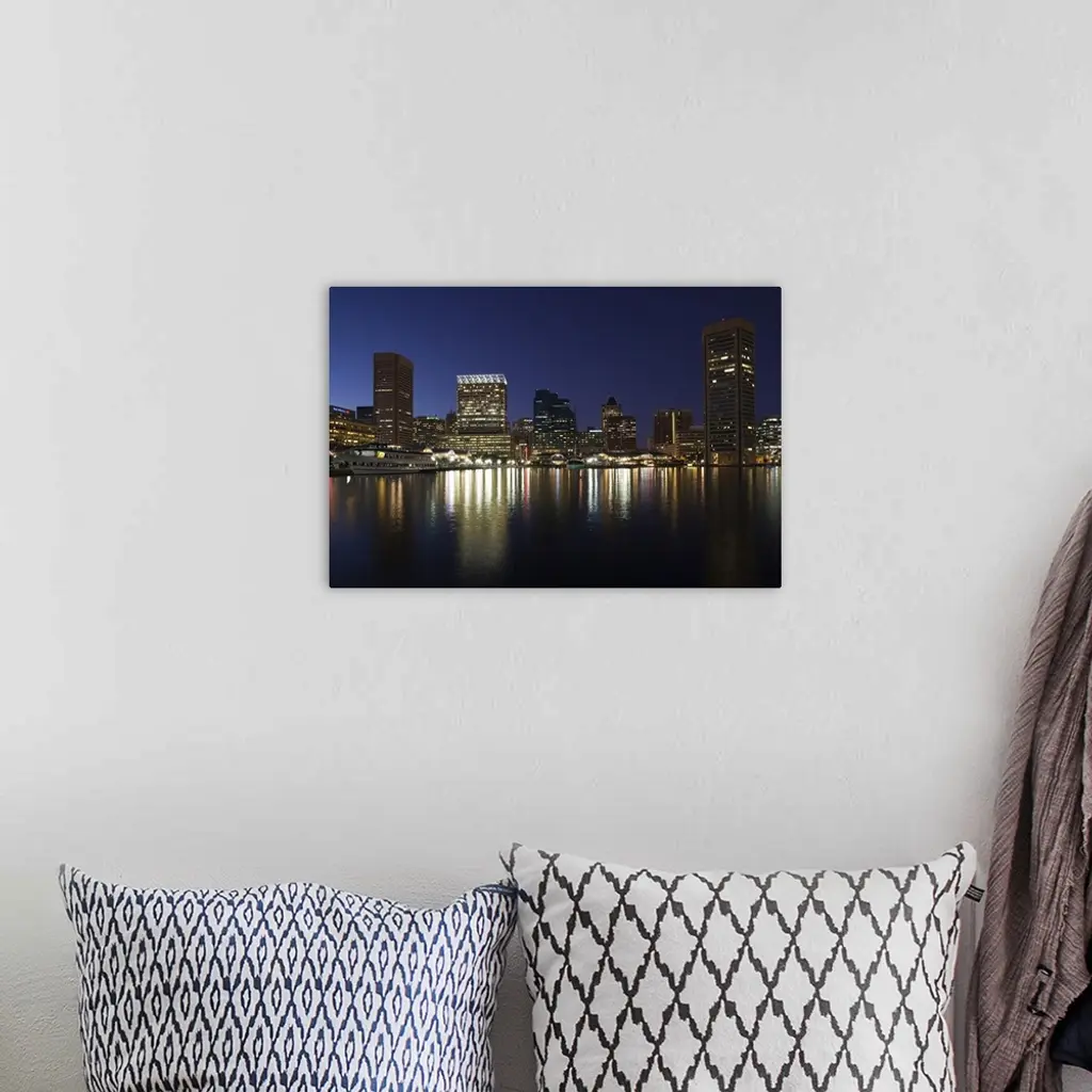 City skyscrapers reflecting their lights onto the water of the Inner Harbor in Baltimore, Maryland.