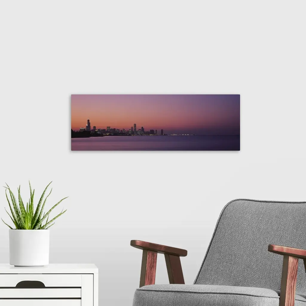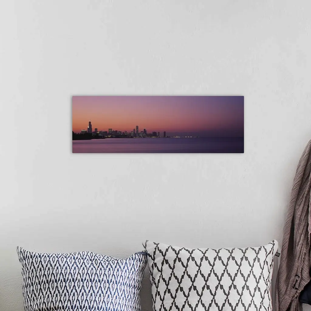 The Chicago skyline is skewed to the left of this panoramic piece and silhouetted by a sunset sky. Lake Michigan largely takes up this photograph.