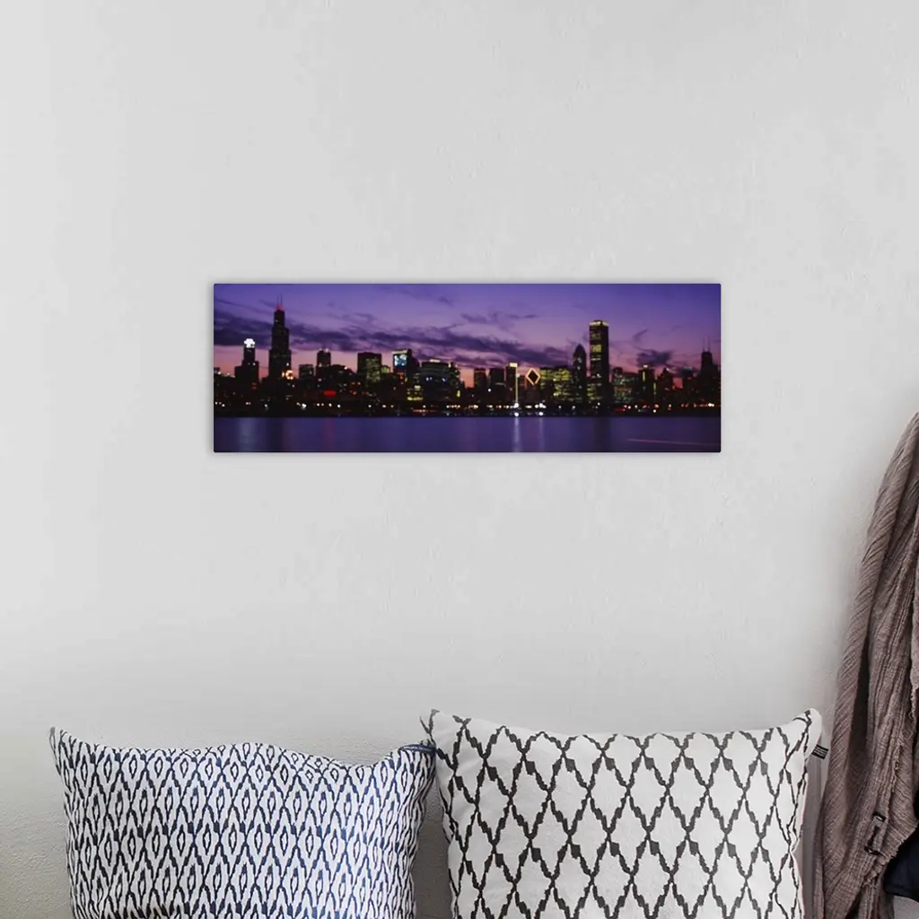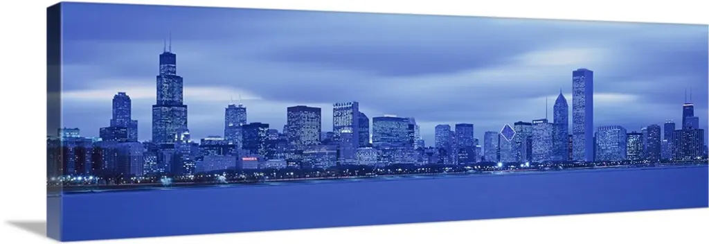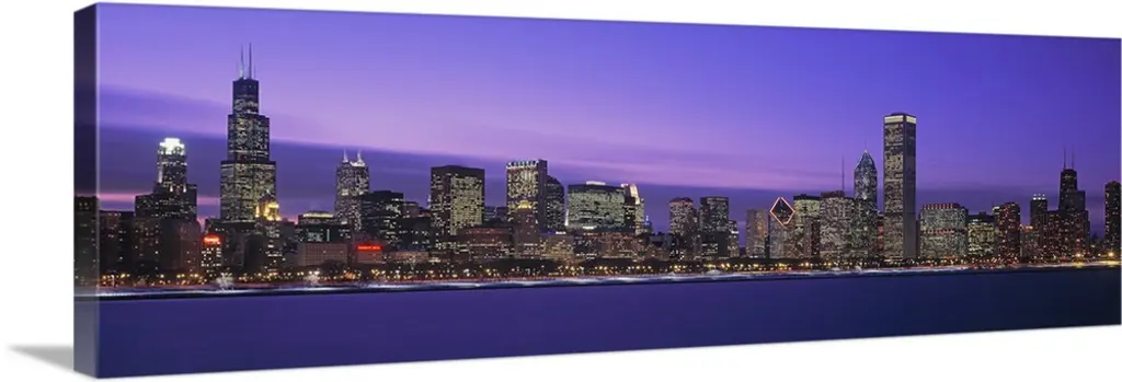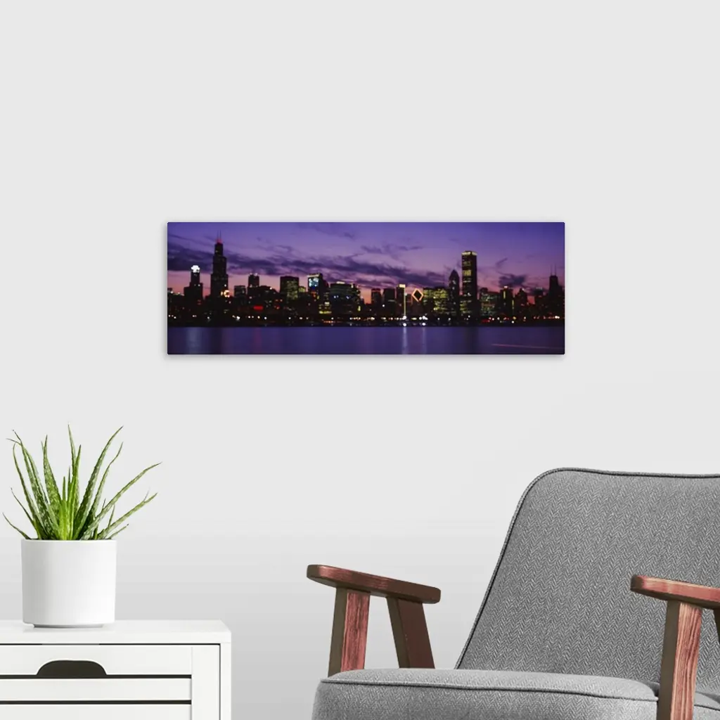 Wide angle view of the Chicago skyline lit beneath a vibrant night sky, over the waters of Lake Michigan.