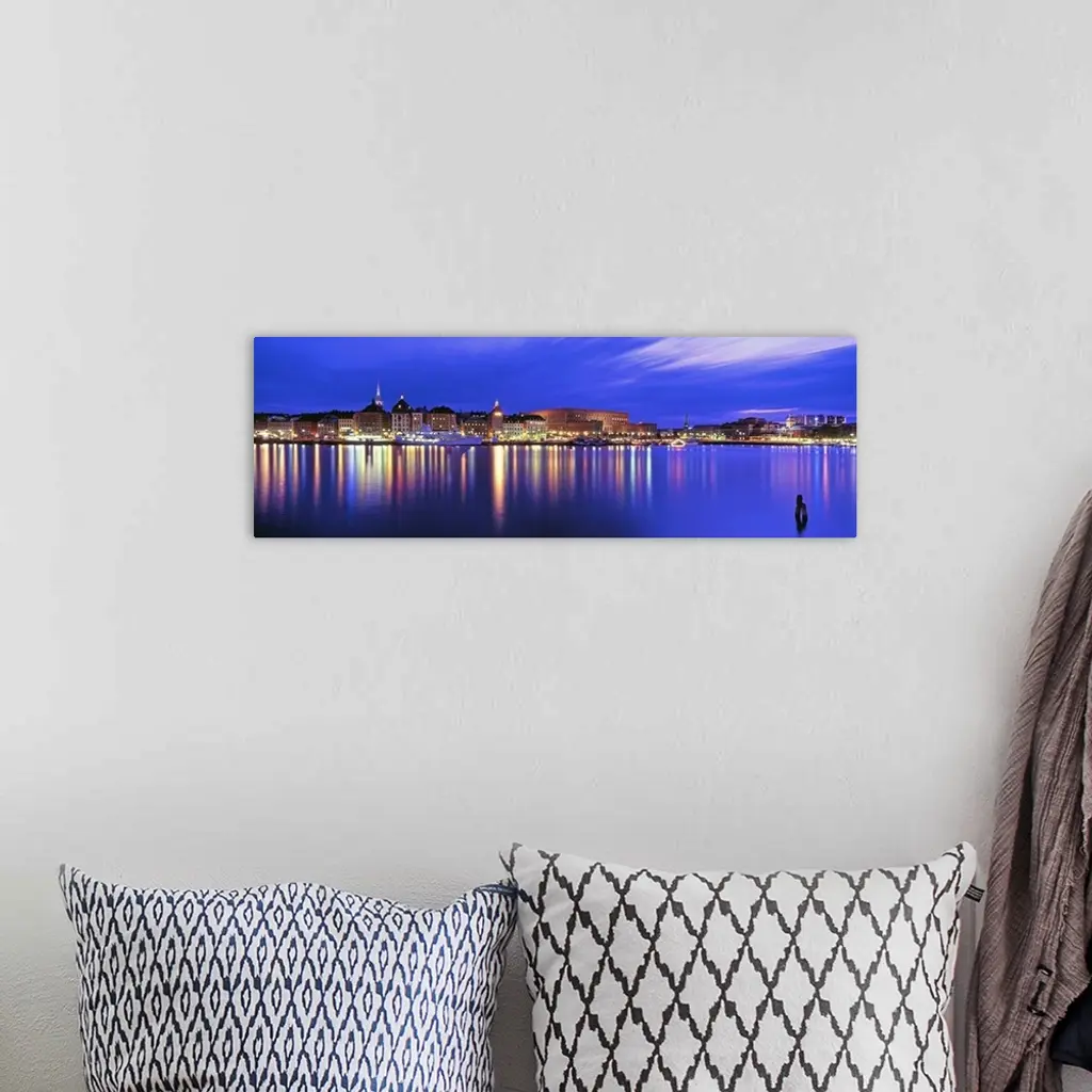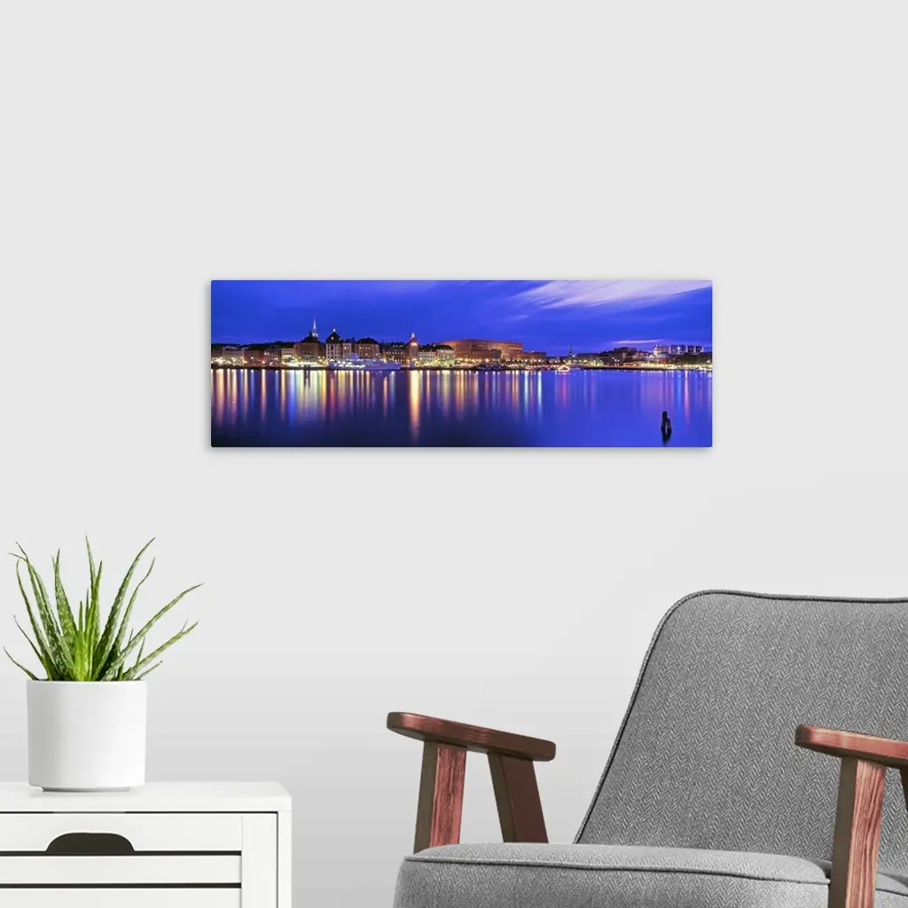 Buildings at the waterfront lit up at dusk, Stockholm, Sweden wall art for home and office decor. Discover canvas art prints, photos, mural, big canvas art and framed wall art in GreatBigCanvas.com's varied collections.