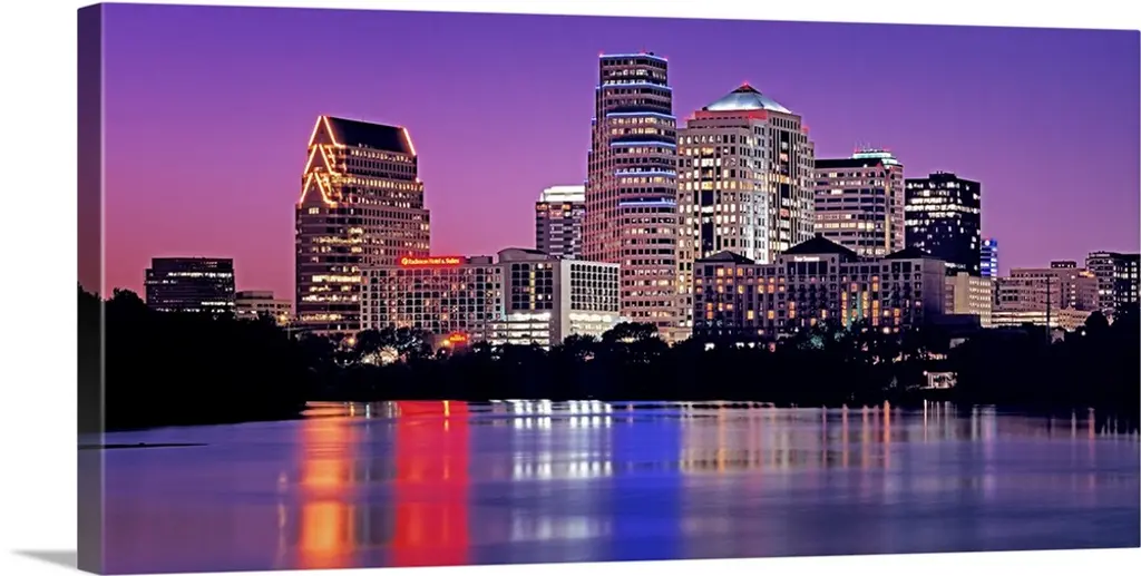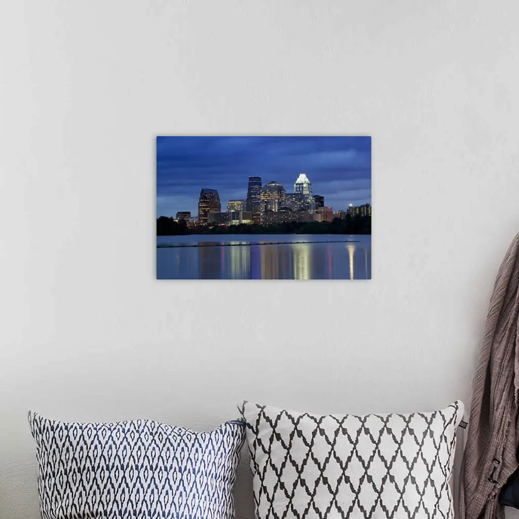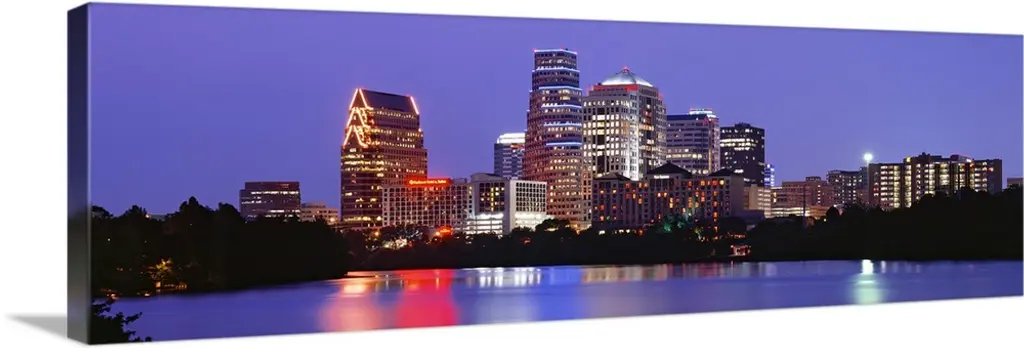 Buildings at the waterfront lit up at dusk, Town Lake, Austin, Texas wall art for home and office decor. Discover canvas art prints, photos, mural, big canvas art and framed wall art in GreatBigCanvas.com's varied collections.