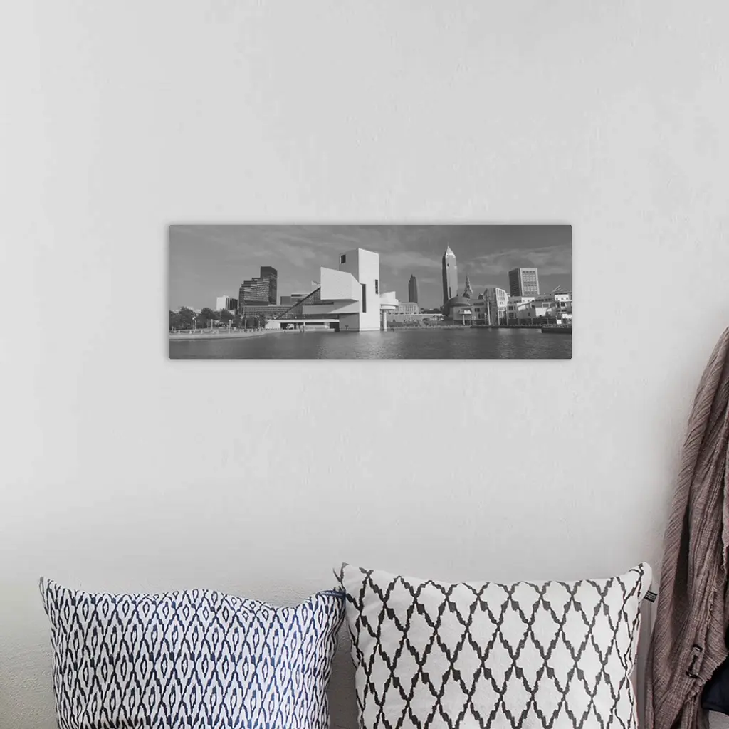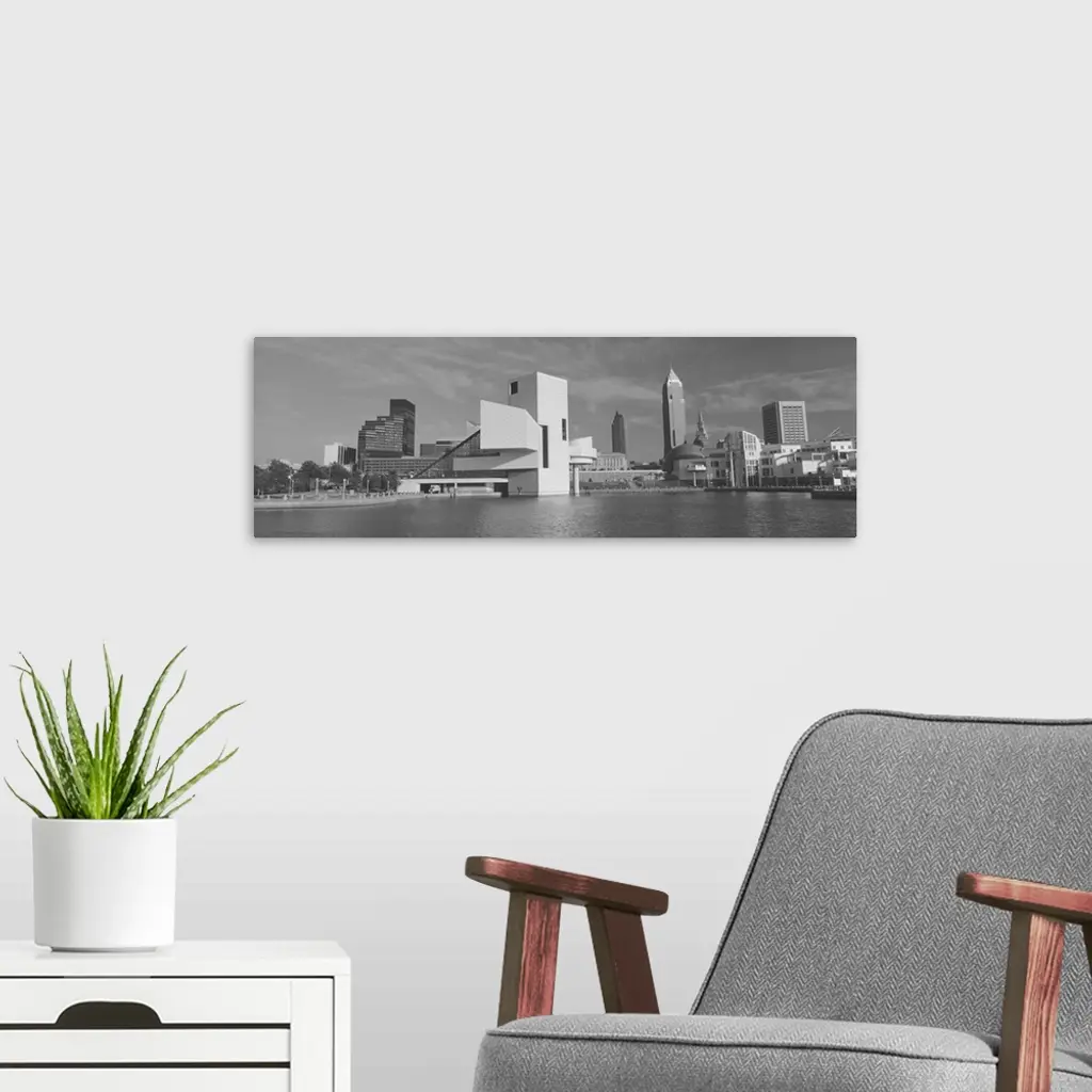A black and white panoramic photograph taken of buildings in Cleveland sitting on water with the rock and roll hall of fame front and center.