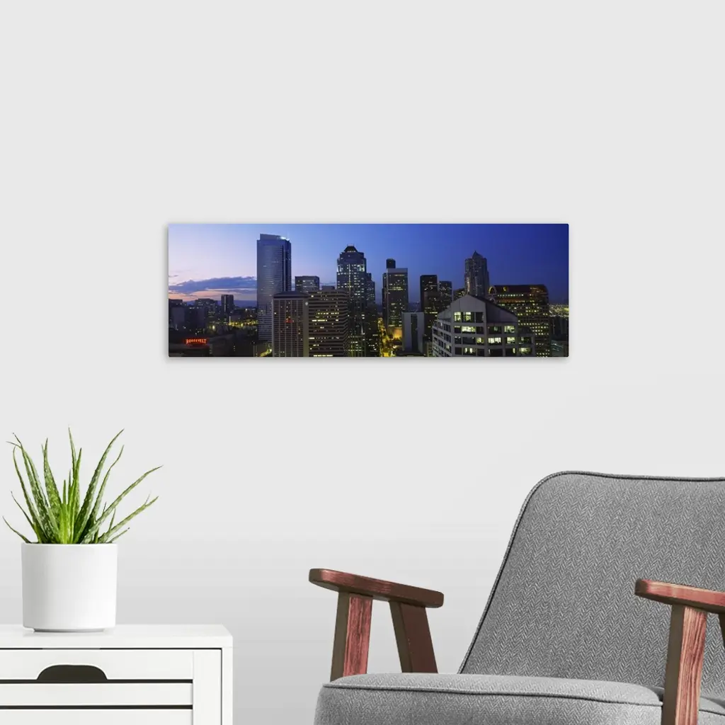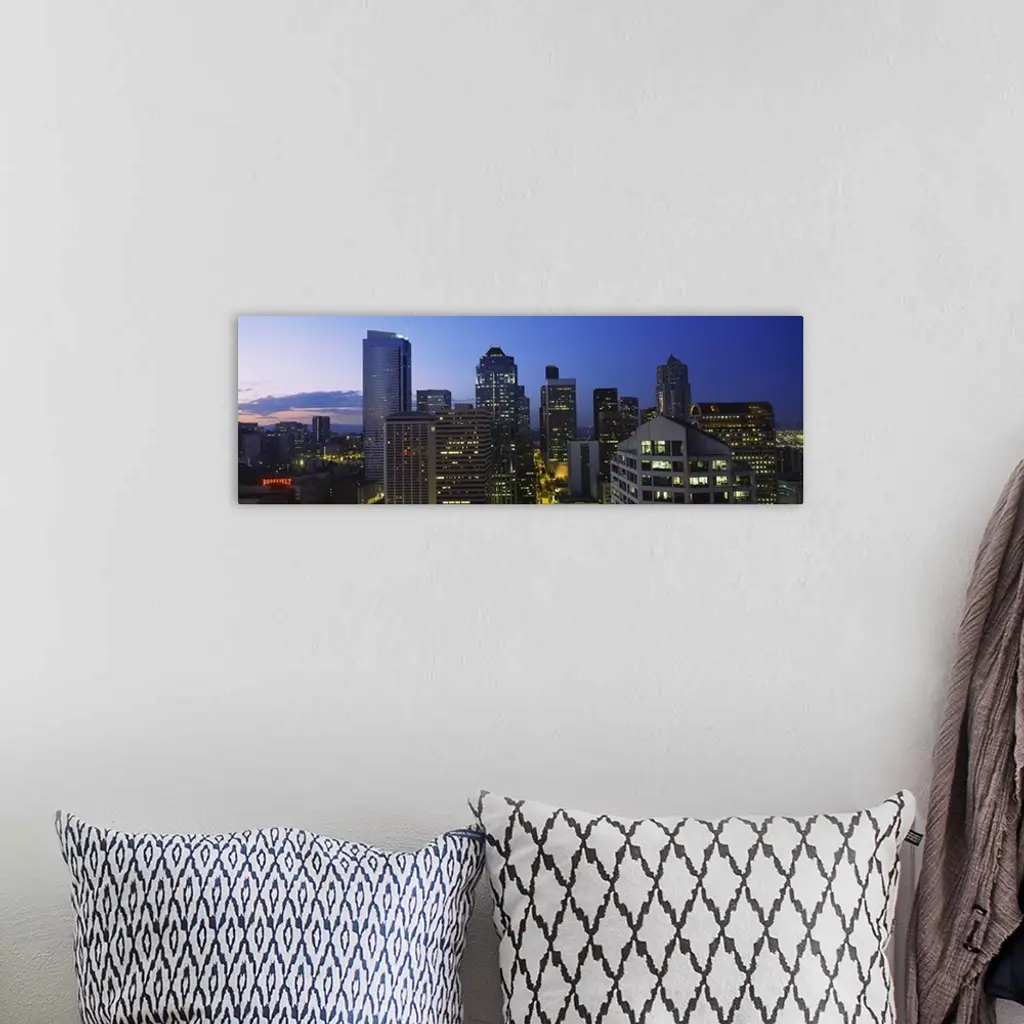 Buildings in a city lit up at dawn, Seattle, Washington State wall art for home and office decor. Discover canvas art prints, photos, mural, big canvas art and framed wall art in GreatBigCanvas.com's varied collections.