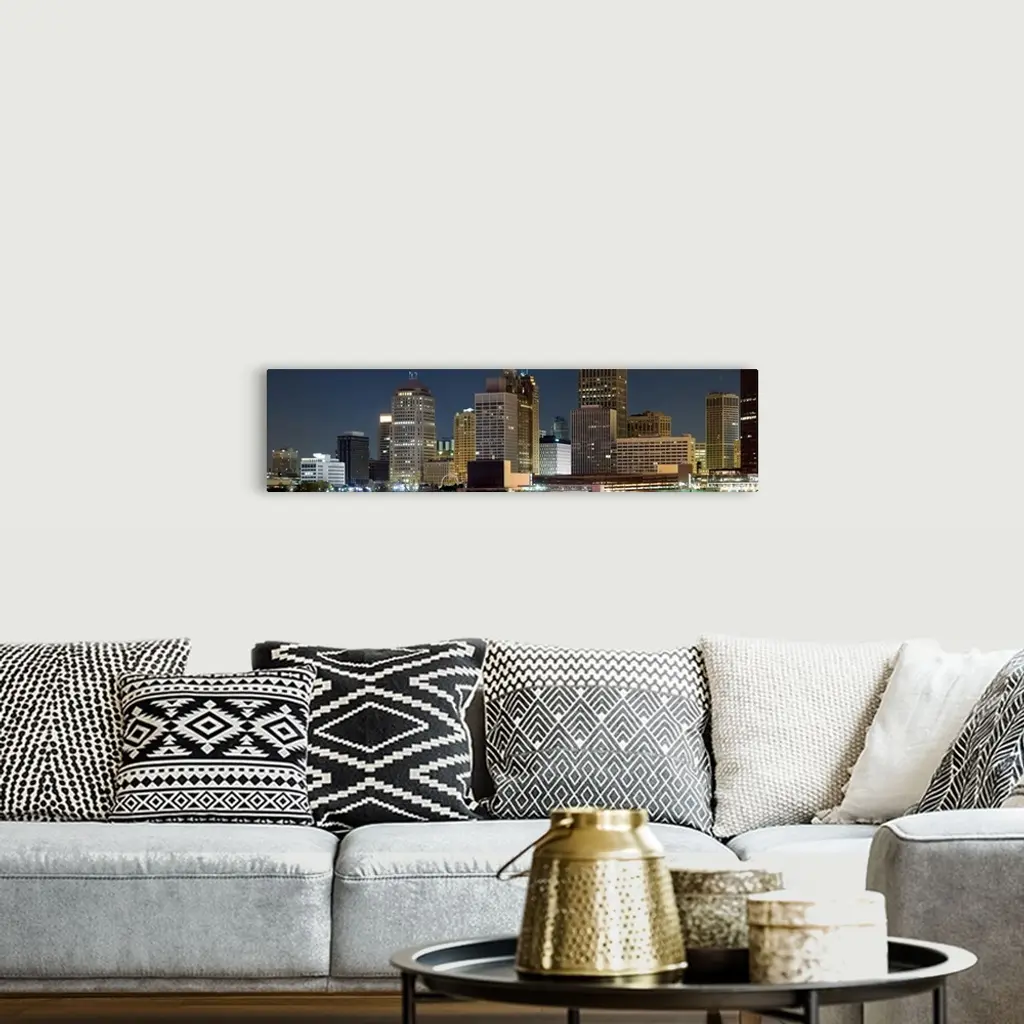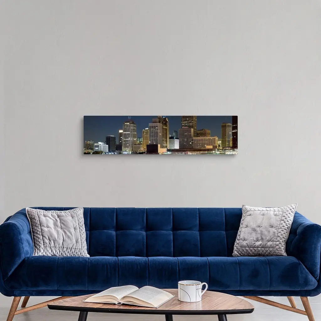 Oversize horizontal photograph of lit skyscrapers against a deep blue sky at night, in Detroit, Michigan.