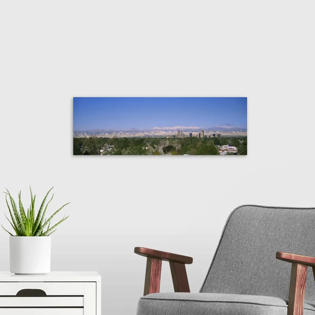The city of Denver is photographed from a distance over trees and homes. Mountains are pictured far off in the background.