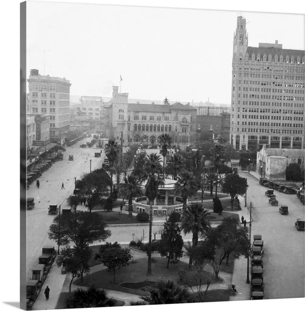The Guardian Building (tall tower on l) and the Penobscot Building (tall tower on r) tower over a public square in the heart of Detroit, Michigan.