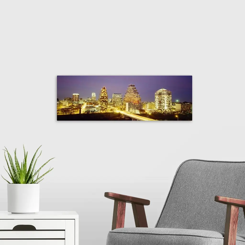 Panoramic photo of a cityscape brightly lit up at night with slow exposed car lights going through the city.
