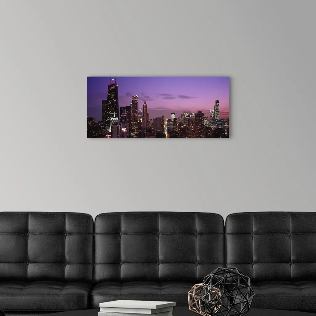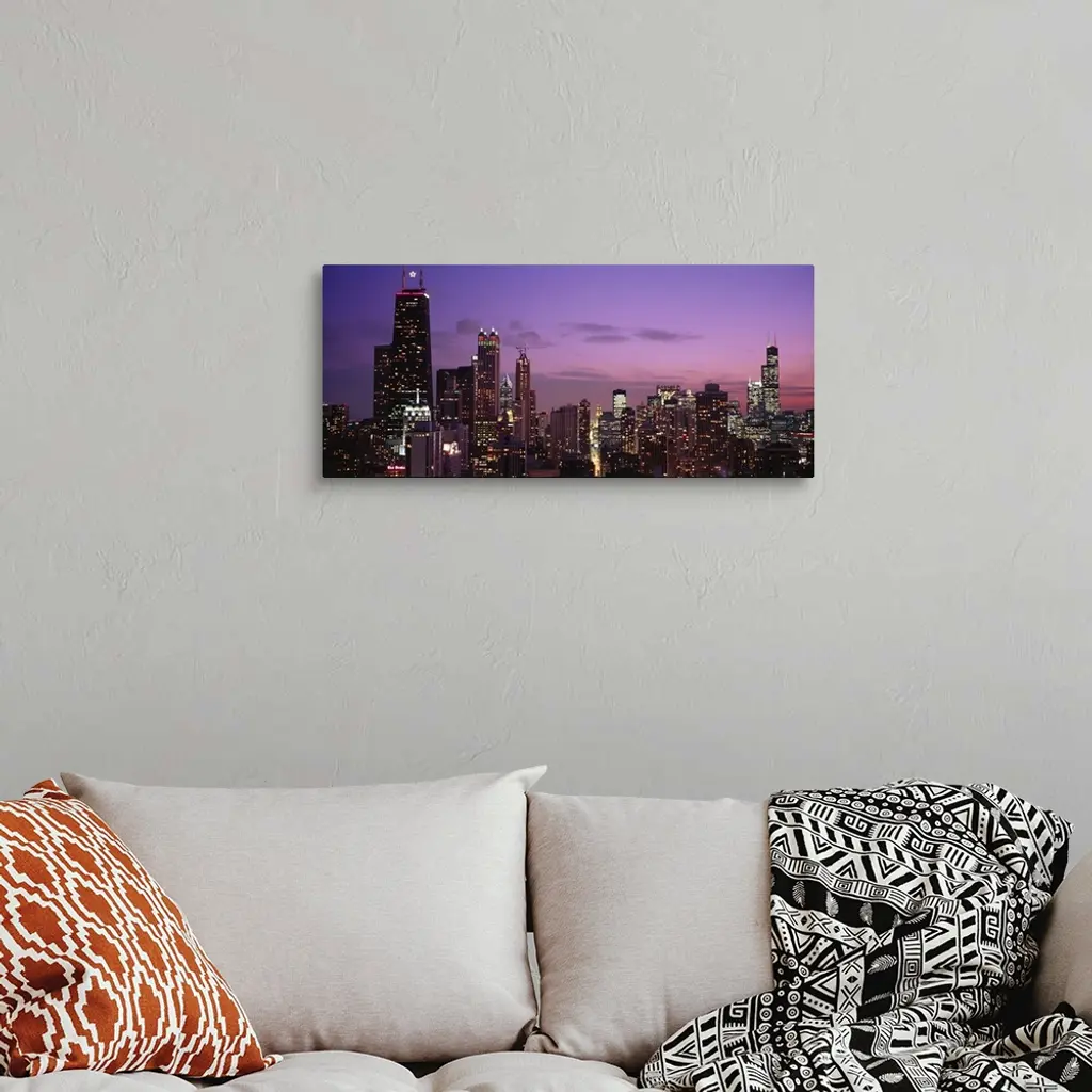 Dusk panoramic shot of the tops of lit up buildings in downtown Chicago.