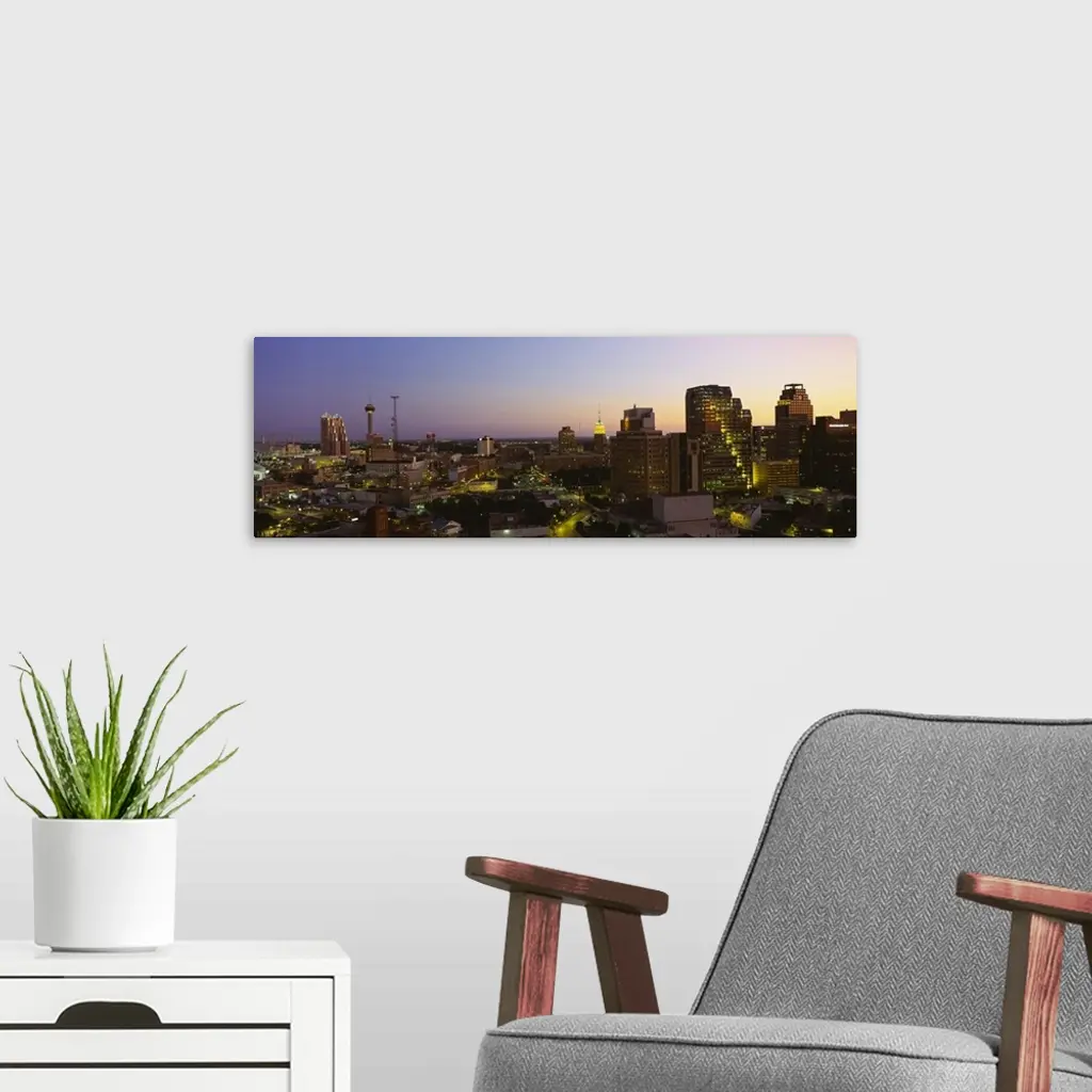 Big panoramic view of the San Antonio skyline lit up while the sun is setting.
