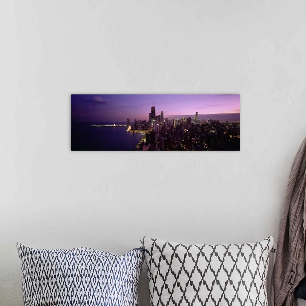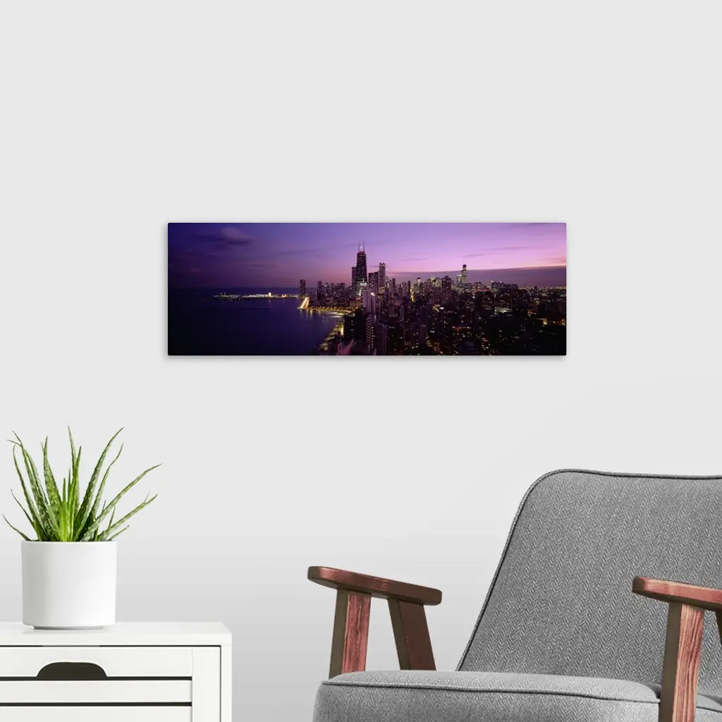 Narrow and horizontal canvas of downtown Chicago lit up at night with the waterfront on the left.