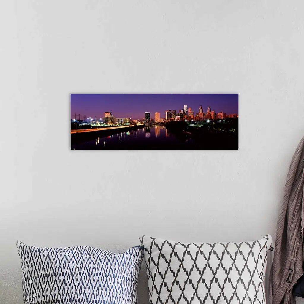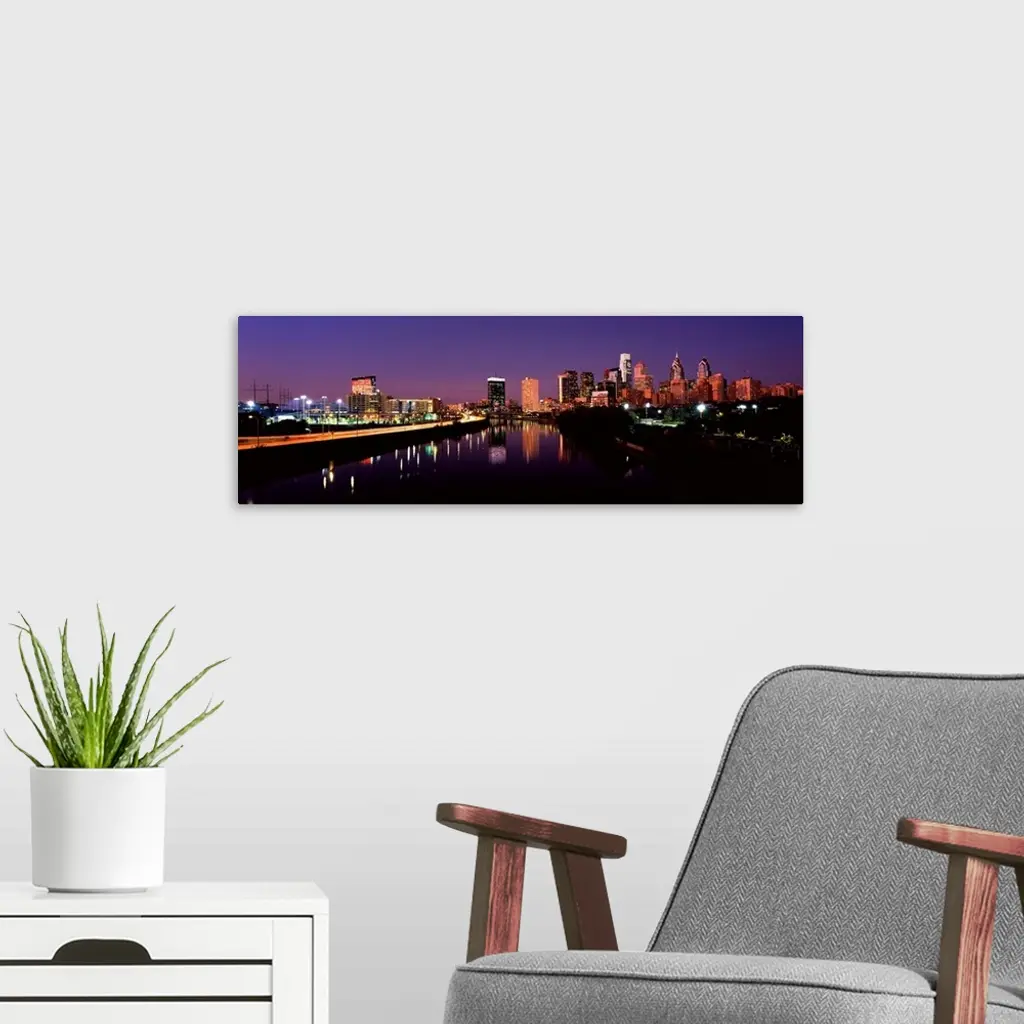 Buildings lit up at the waterfront, Philadelphia, Schuylkill River, Pennsylvania wall art for home and office decor. Discover canvas art prints, photos, mural, big canvas art and framed wall art in GreatBigCanvas.com's varied collections.