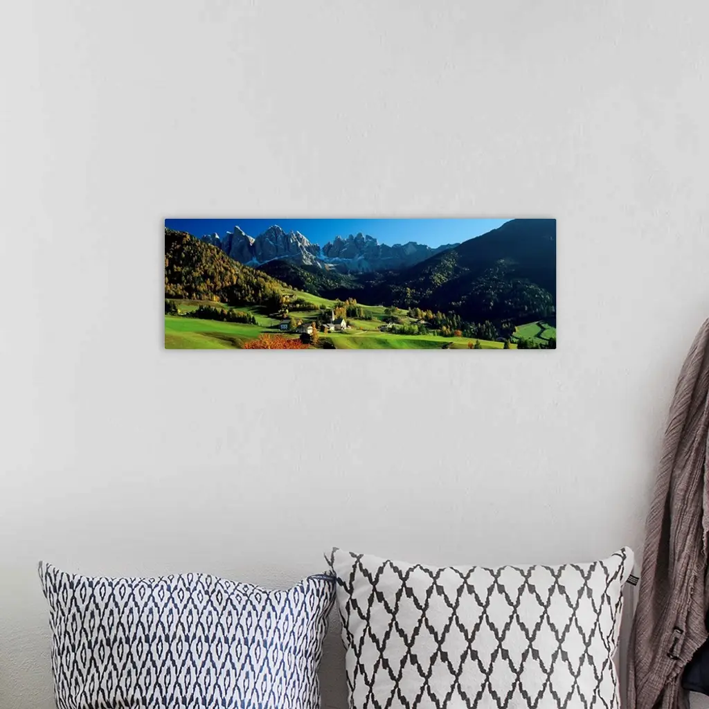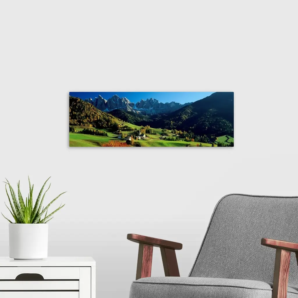Buildings On A Landscape, Dolomites, Funes Valley, Le Odle, Santa Maddalena, Tyrol, Italy