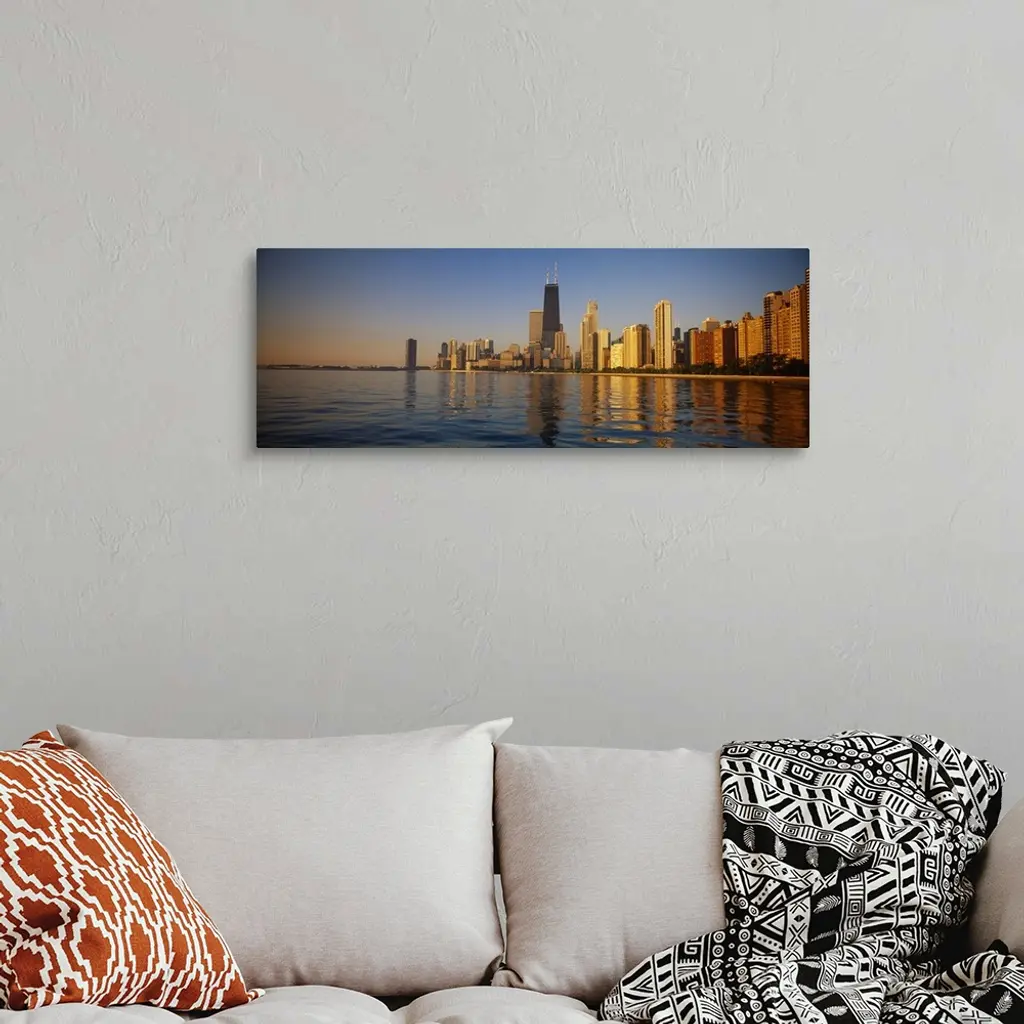 Long horizontal photo of the skyline of Chicago meeting the water front at sunset printed onto canvas.