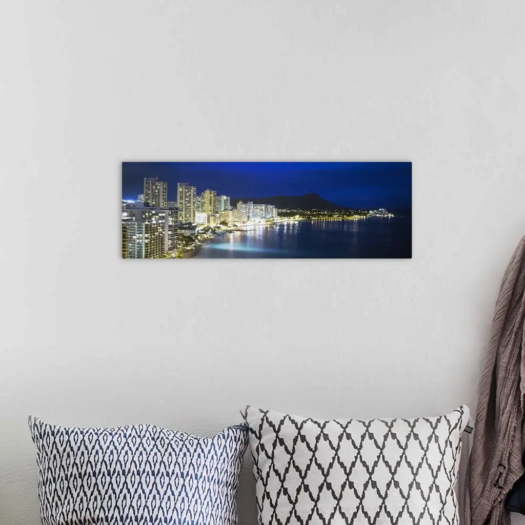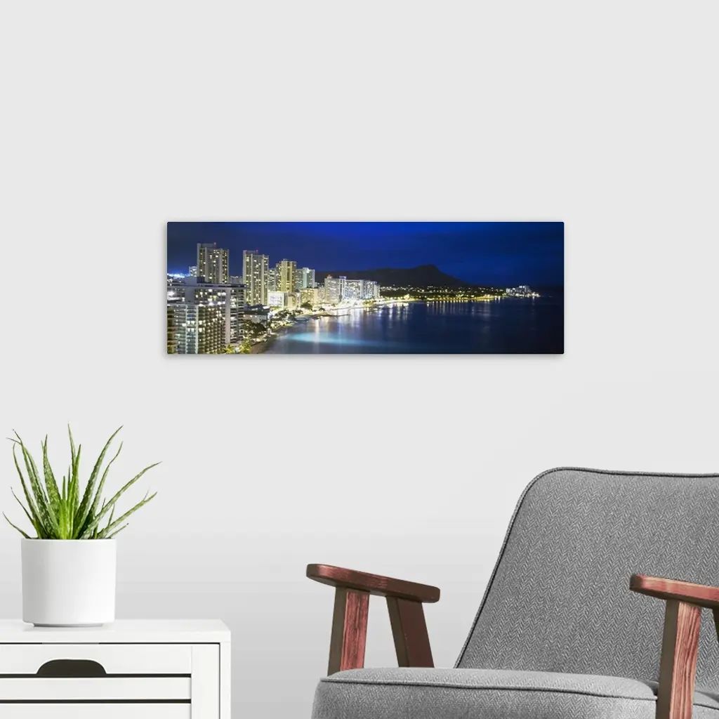 Panoramic photograph shows an illuminated skyline shining brightly on the coast of an island within the Pacific Ocean while a small mountain sits in the backdrop. The bright lights of the skyscrapers and surrounding structures reflect over the water below.