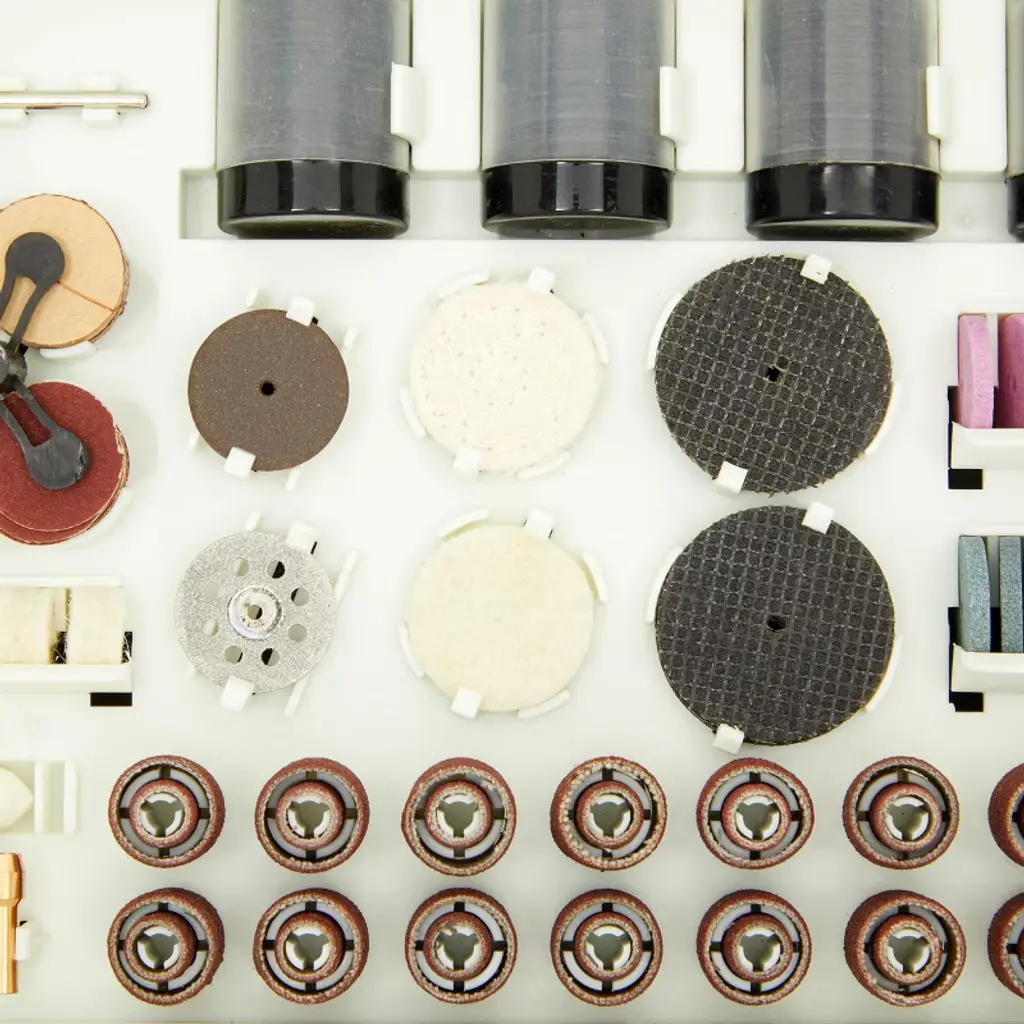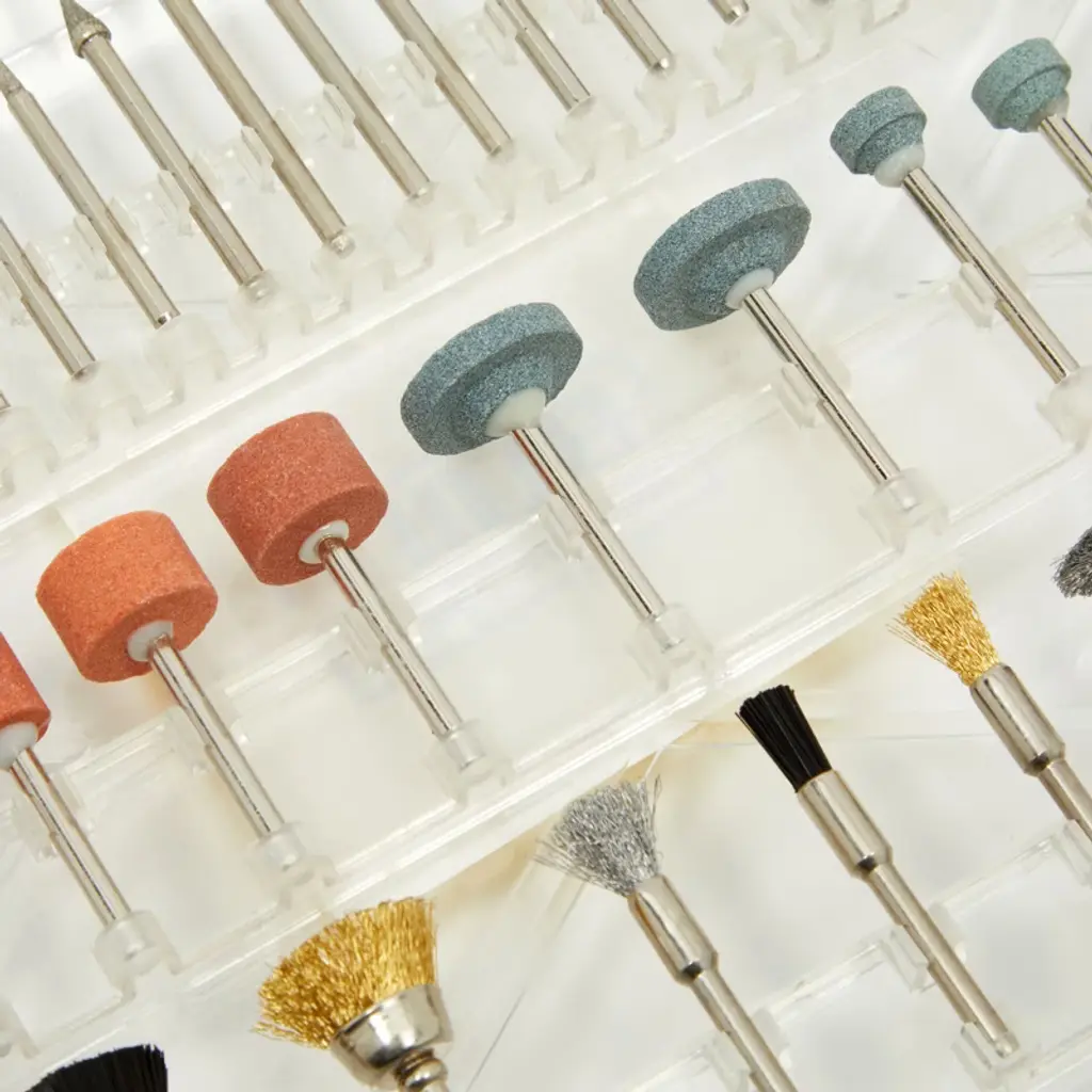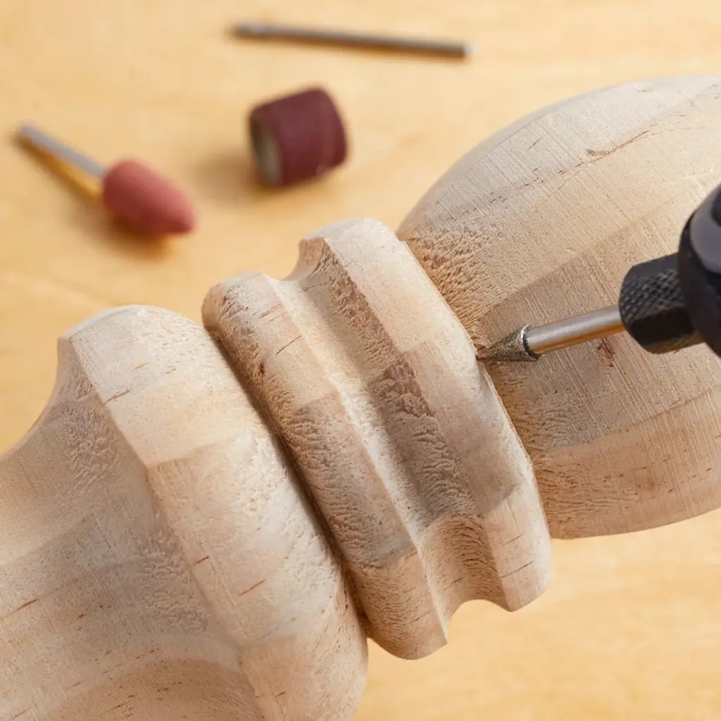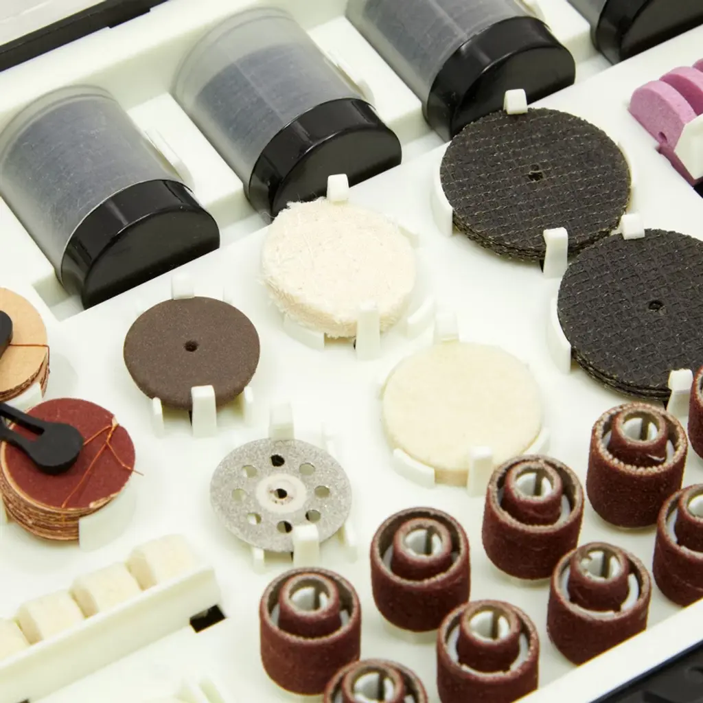 Create unique woodworking pieces with personalized designs with this 365 pieces rotary tool kit. The kit includes collets, sanding bands, felt wheels, cut-off wheels, stainless steel brushes, diamond bits, and more bits needed for woodworking. Use the kit professionally or at home for hobbies and crafts. The tool bits come in a strong carry case that compartmentalizes each bit and holds them in place.