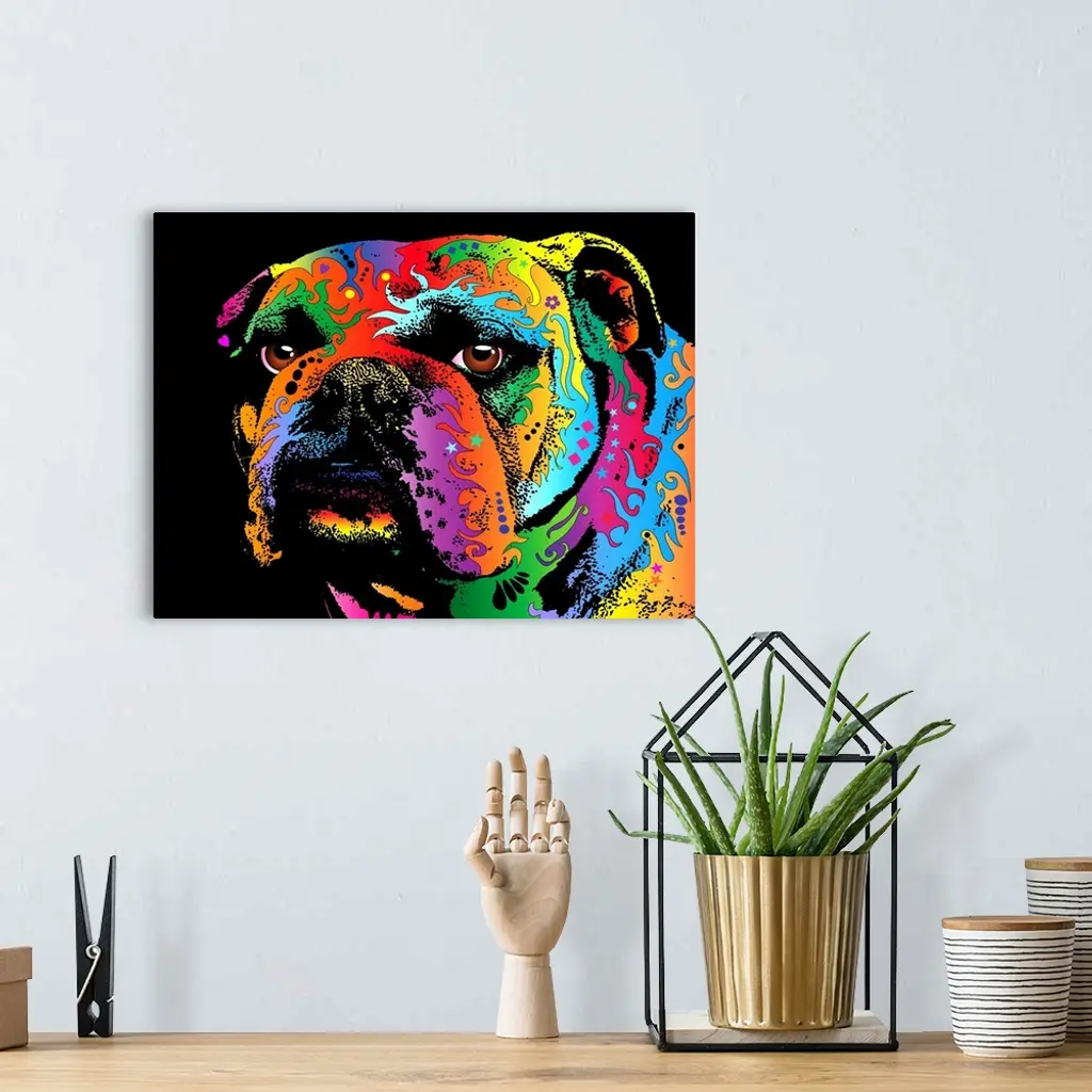 A bulldog is the common name for a breed of dog also referred to as the English bulldog or British Bulldog. Other bulldog breeds include the American bulldog and the French bulldog. The bulldog is a breed with characteristically thick shoulders and a matching head. There are generally thick folds of skin on a bulldog's brow, followed by round, black, wide-set eyes, a short muzzle with characteristic folds called rope above the nose, with hanging skin under the neck, drooping lips, and pointed teeth. Winston Churchill was granted the compliment of possessing more than a passing resemblance to the bulldog and was described as having an unwavering 'bulldog spirit'.