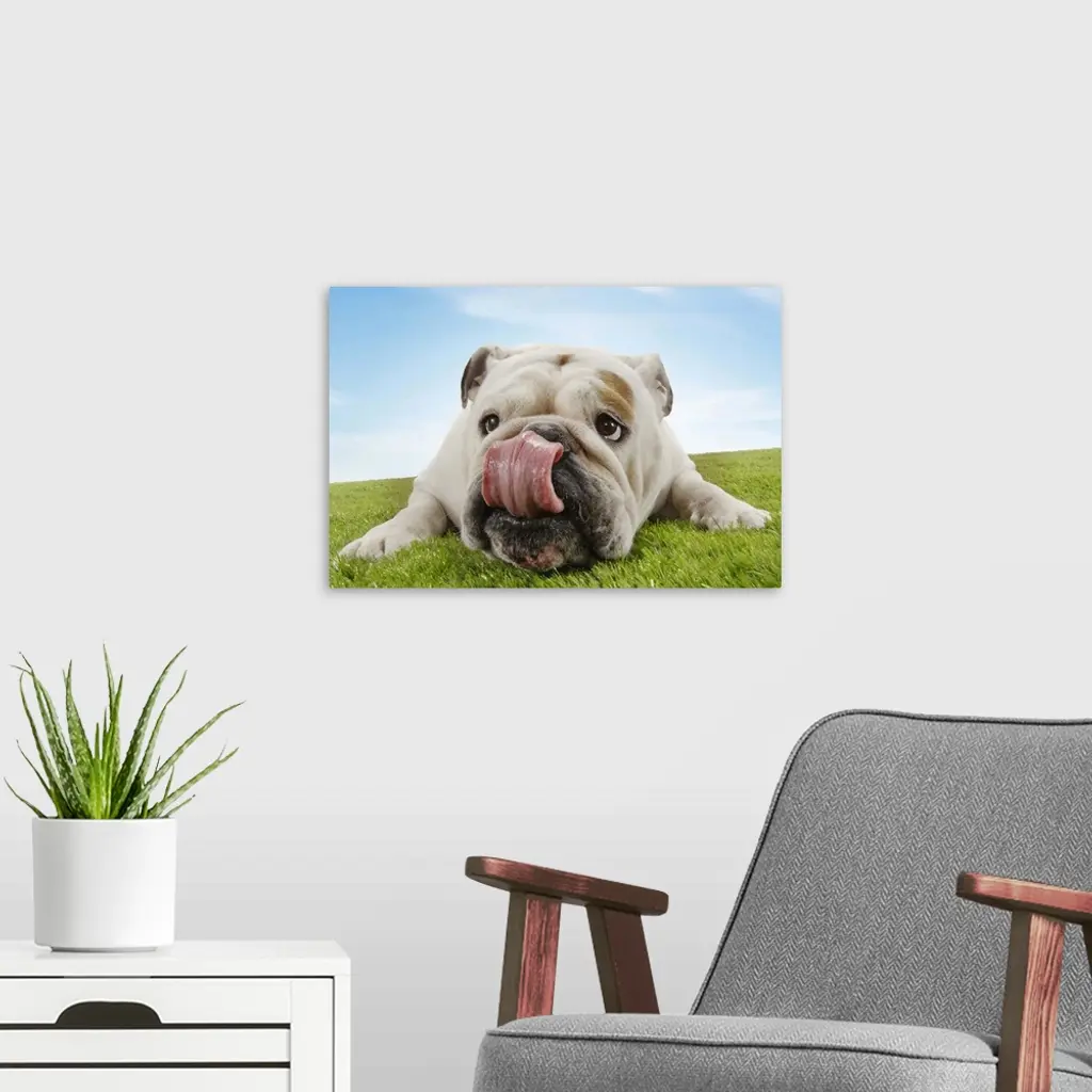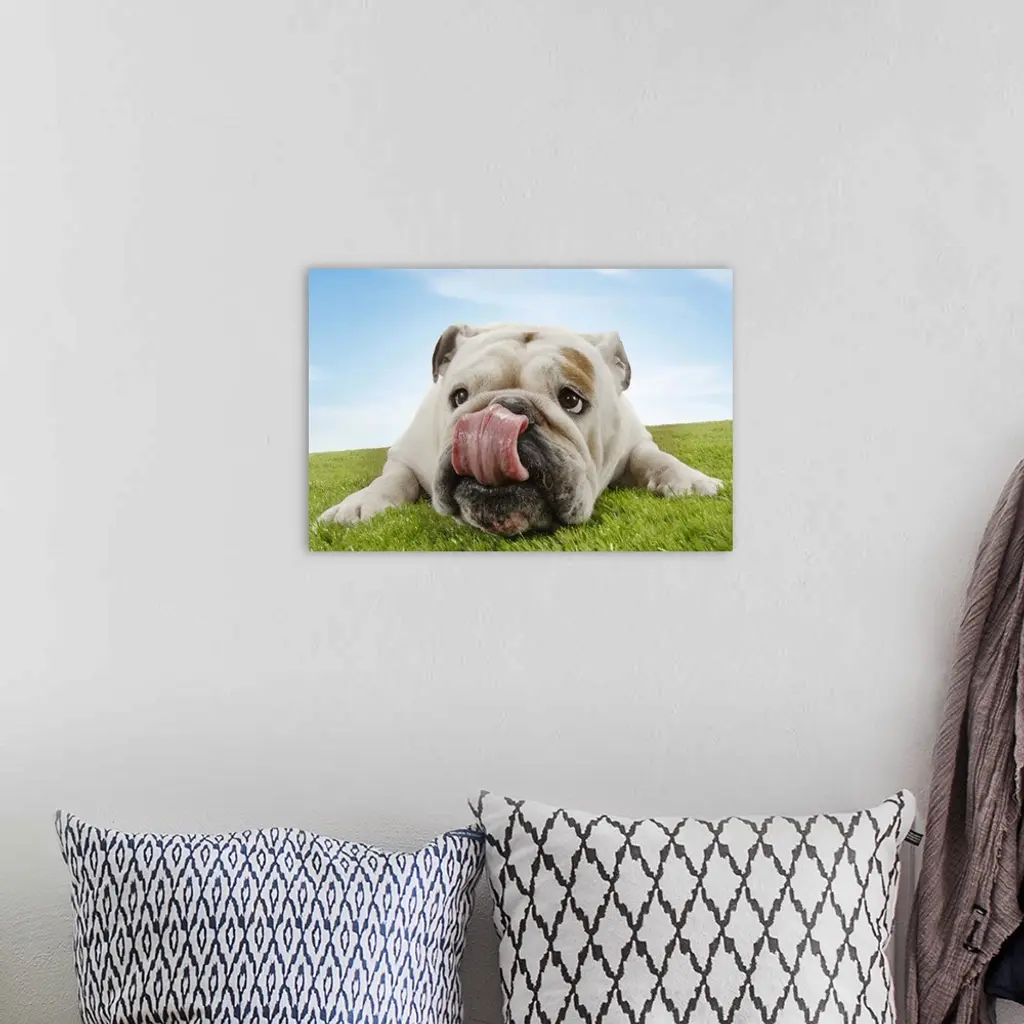 Bulldog Lying on Grass Licking Lips wall art for home and office decor. Discover canvas art prints, photos, mural, big canvas art and framed wall art in GreatBigCanvas.com's varied collections.