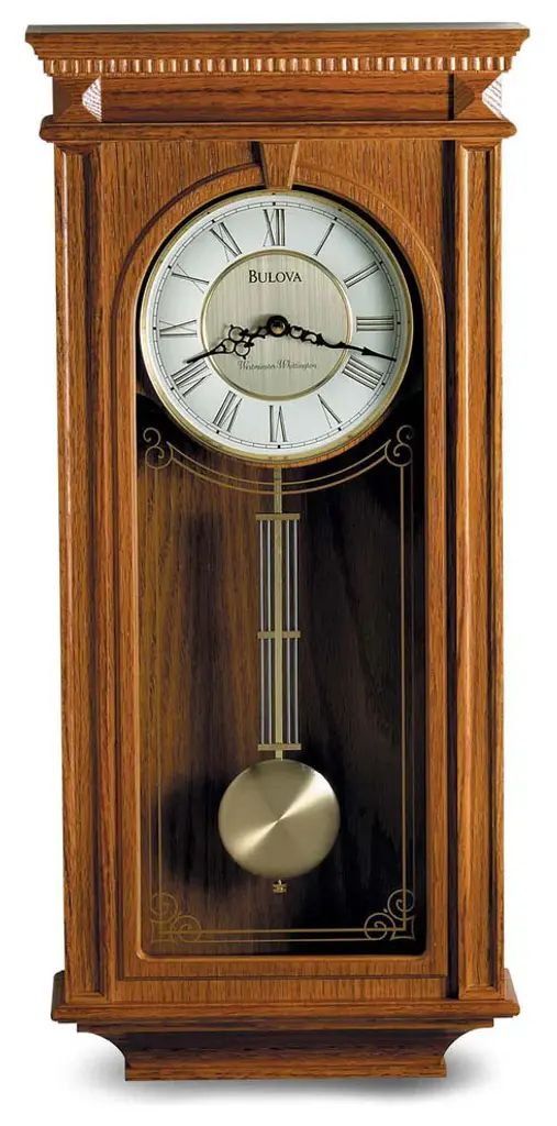 Bulova C4419 MANORCOURT ClockC4419 MANORCOURT Oak case, golden oak finish. Two-tone metal dial. Harmonic 2triple-chime movement plays choice of Westminster, Ave Maria or Bim-Bam melody on the hour. Adjustable volume control. Brass finish metal dial and pendulum. Decorative screened glass. Requires (1) AA, (2) C batteries, not included. H: 24.25" W: 11.25" D: 4.75", H: 62cm W: 29cm D: 12cm Brand:-BulovaBulova C4419 MANORCOURT ClockProduct Dimension W:-11.25Product Dimension L:-4.75Product Dimension H:-24.25ItemNumber#C4419Product Dimensions (W x D x H): 11.25 x 4.75 x 24.25