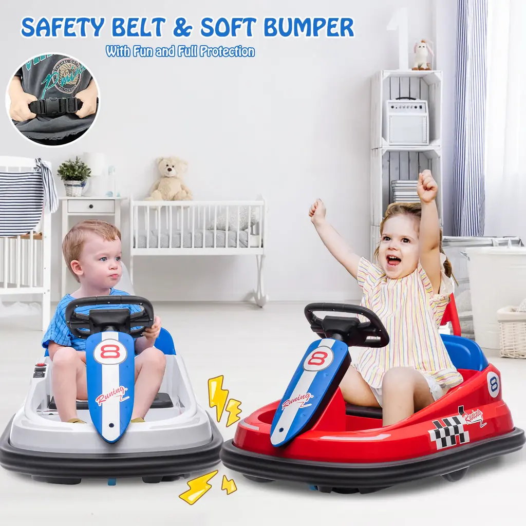 【ENTIRELY NEW DESIGN】The curved profile of the frame combined with a thick rubber-like bumper, the toddler bumper car lets them race, chase, spin and bump. Steering wheel and pedal controls on this 6V kids car allows your kid to have worry-free, non-frustrating, endless entertainment. 【GET READY TO SPIN】This awesome new-designed kids bumper car can spin a full 360 degrees with simple steering wheel controls. With special light and sound effects it's just like being at the fair. With a maximum speed of 1.9 mph this bumper car is a great introduction to electric ride-on cars. 【Top Safety Features】The ride-on bumper car has an adjustable seat belt, anti-flat tires and sturdy plastic shell construction for a safer ride. This awesome electric vehicle has a soft PVC rubber anti-collision strip making it a safe ride on toy for your kids and protect walls and furniture. 【PREMIUM PERFORMANCE】The kids car has forward/reverse and turn controls. the music and horn function make your kids enjoy a funny and safe driving experience. Includes a rechargeable 6V battery that lets your kids enjoy 1-2 hours of riding fun. Battery charging time is about 8-12 hours. 【GIFT FOR BOYS&GIRLS】This bumper car is a perfect addition to interactive and group games. Kids can bump each other for more riding fun. Overall Dimensions: 29.3"(L) x 18.9"(W) x 18.3"(H); Weight capacity: 66 lbs (NOTE: Without Remote Control)