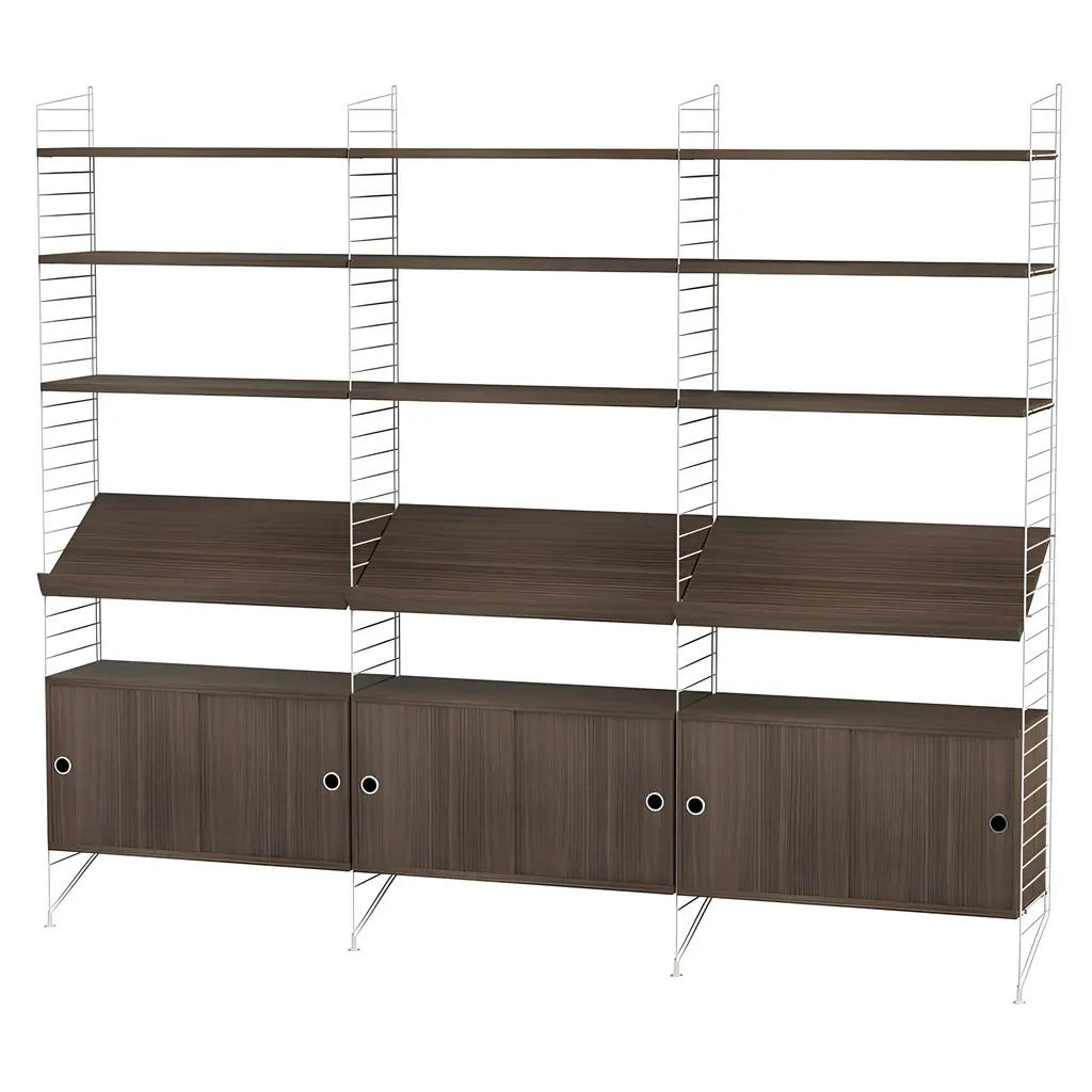 For home or office, String's tripartite preconfigured shelving offers a sweeping expanse for all manner of books and periodicals as well as plenty of room to display cherished objects. And the 3 roomy cabinets with handy sliding doors down below keep other material neatly hidden and the overall look clutter-free. The timeless style of Nils Strinning's system first introduced in 1949 proves just as apt today, with its familiar coated-wire framework and wood elements in the collection’s full range of veneer and painted finishes.