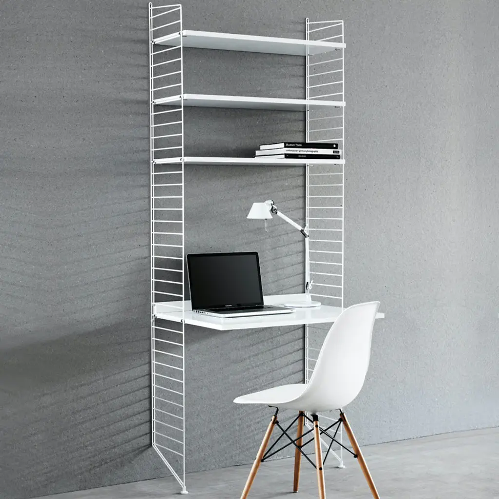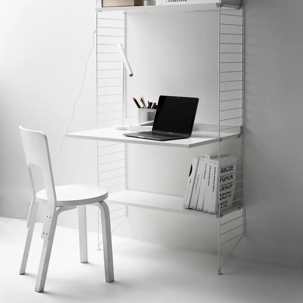 For office or home, this floor-mounted String single bay maximizes a limited workspace. Combining 3 spacious upper shelves and an extended desktop in the familiar coated-wire structure, it's available in the collection’s full range of woodgrain veneer and painted finishes. String's series of pre-arranged bundles is also infinitely expandable as needs change in the future—another testament to the genius of Nisse Strinning's enduring 1949 modular system.