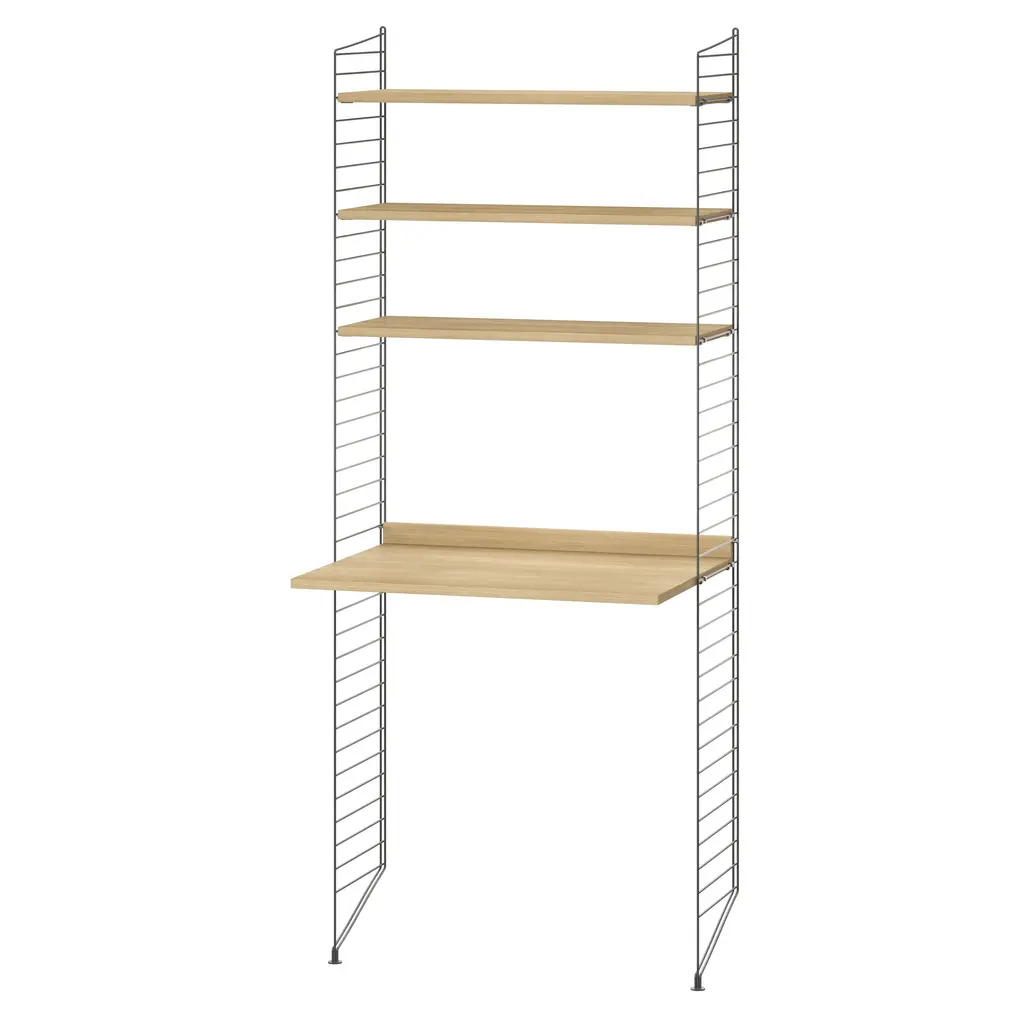 For office or home, this floor-mounted String single bay maximizes a limited workspace. Combining 3 spacious upper shelves and an extended desktop in the familiar coated-wire structure, it's available in the collection’s full range of woodgrain veneer and painted finishes. String's series of pre-arranged bundles is also infinitely expandable as needs change in the future—another testament to the genius of Nisse Strinning's enduring 1949 modular system.