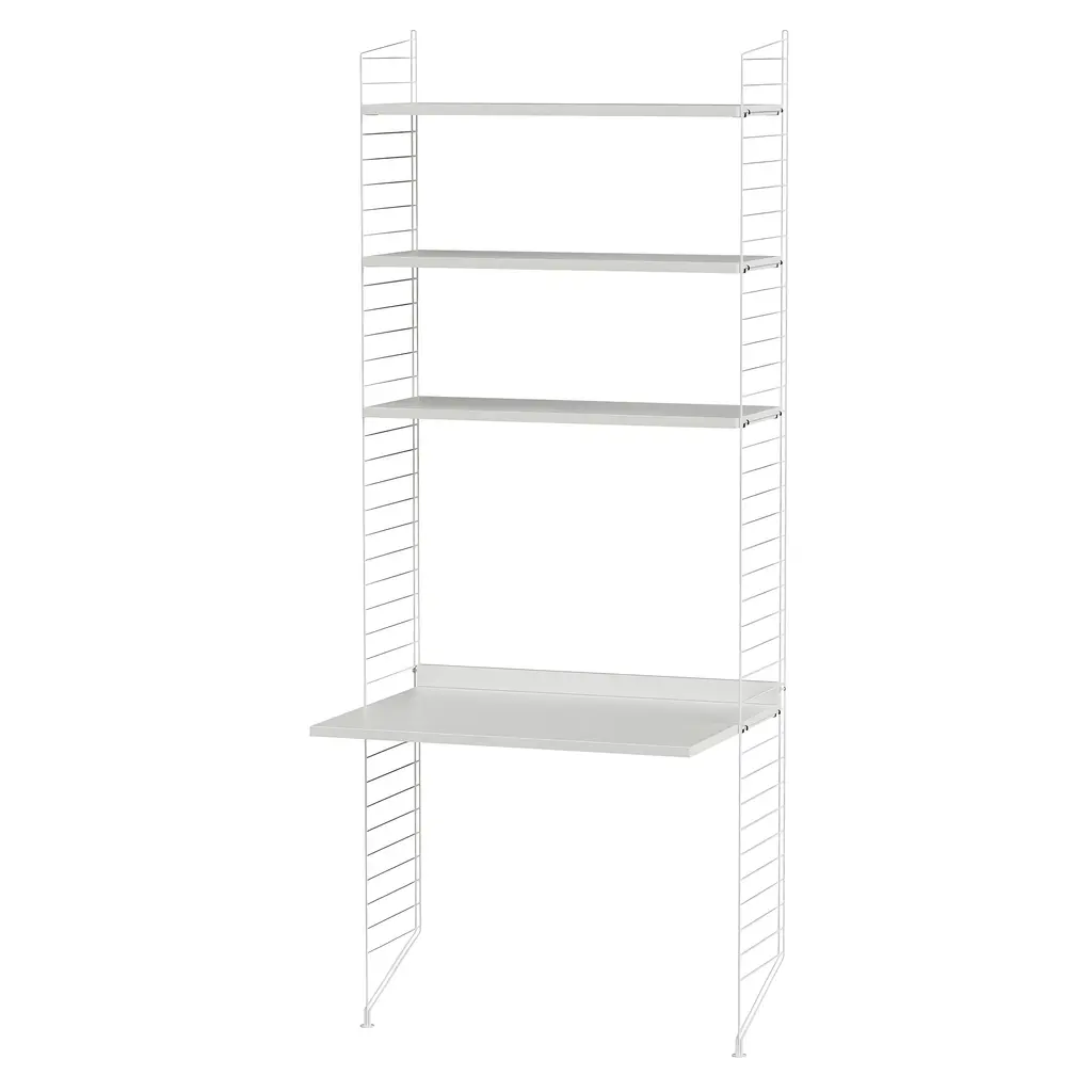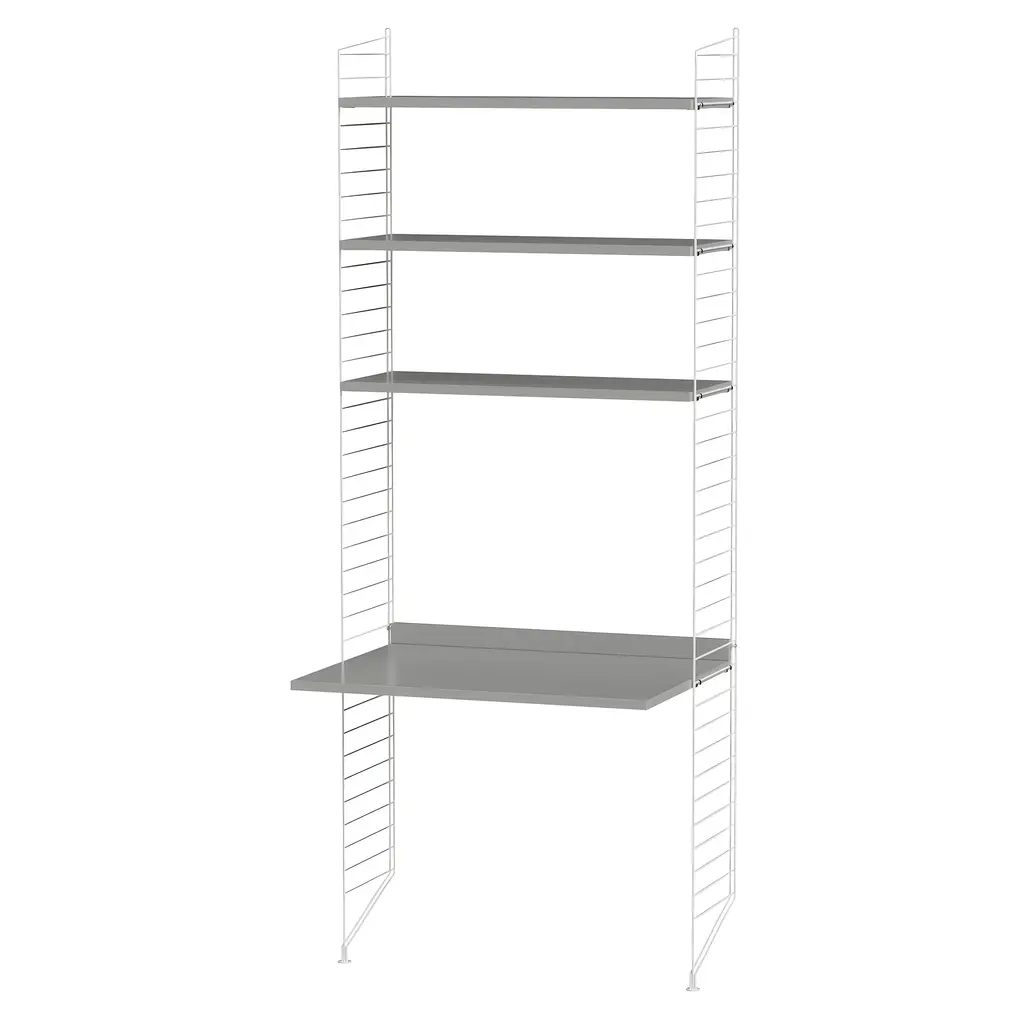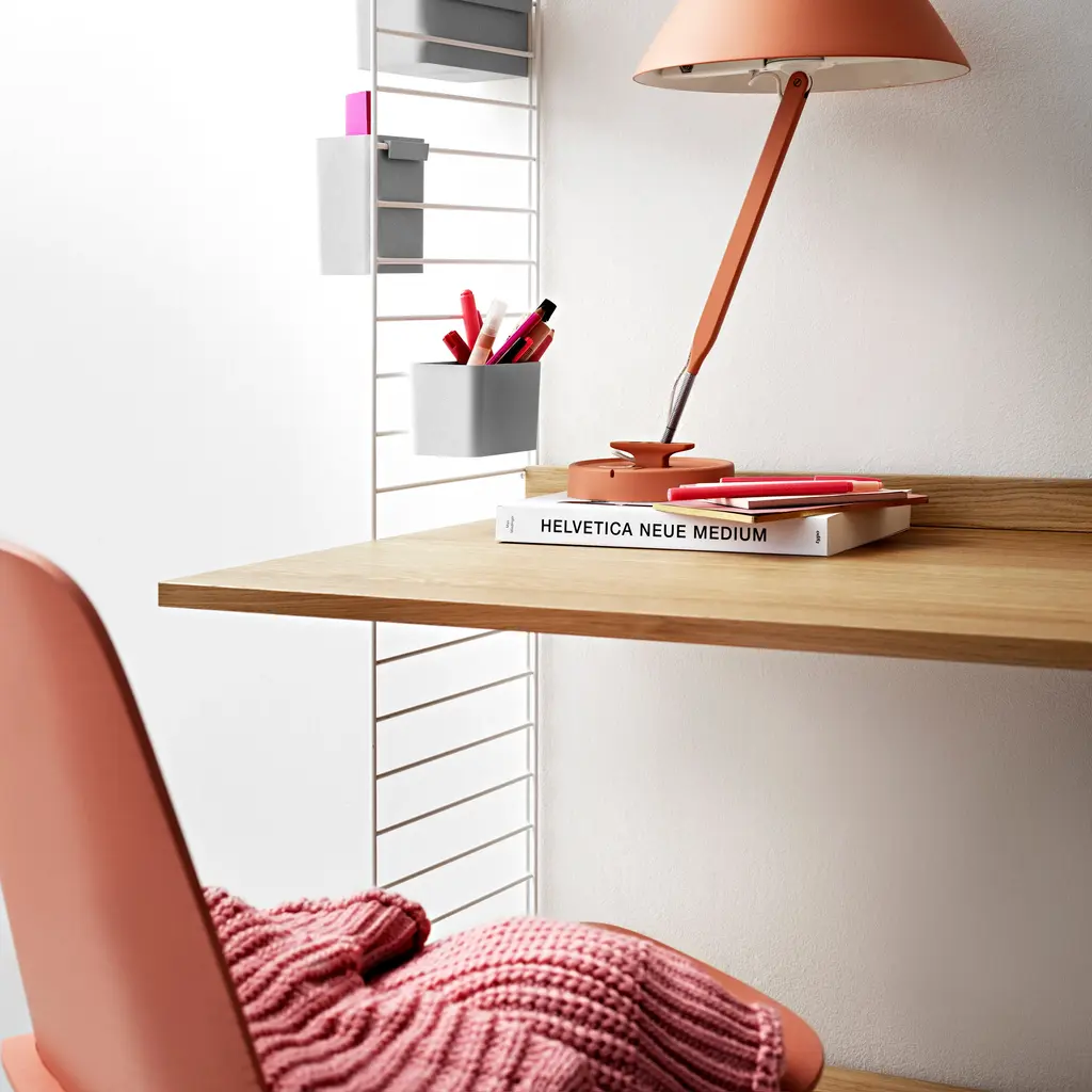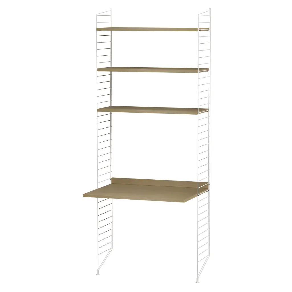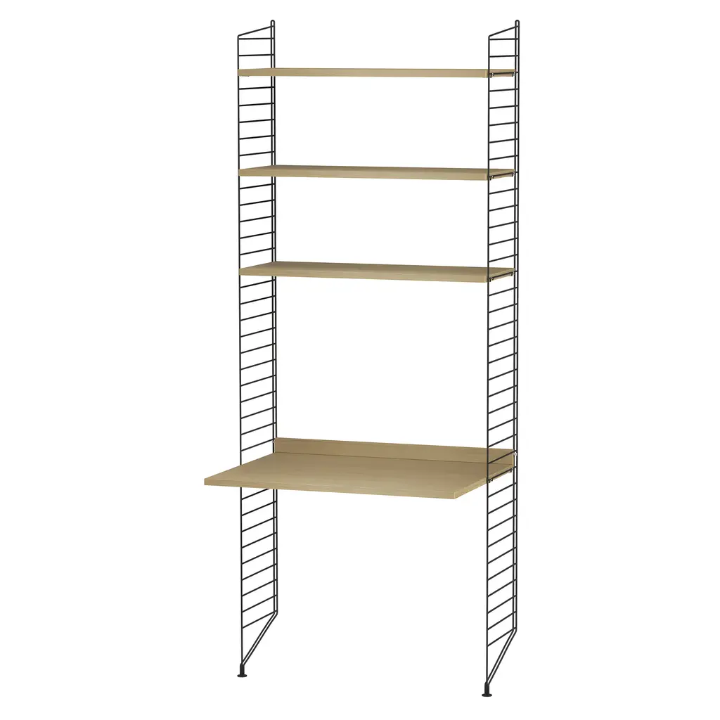 For office or home, this floor-mounted String single bay maximizes a limited workspace. Combining 3 spacious upper shelves and an extended desktop in the familiar coated-wire structure, it's available in the collection’s full range of woodgrain veneer and painted finishes. String's series of pre-arranged bundles is also infinitely expandable as needs change in the future—another testament to the genius of Nisse Strinning's enduring 1949 modular system.
