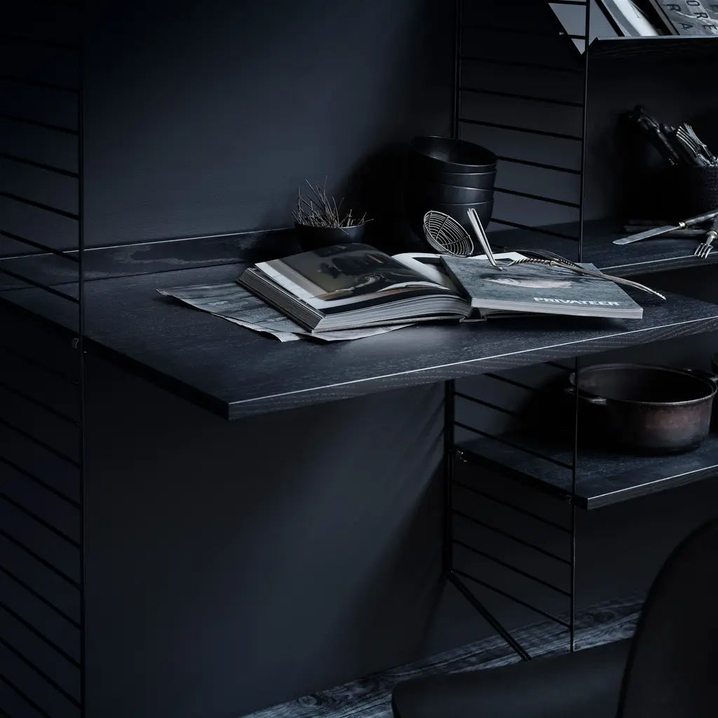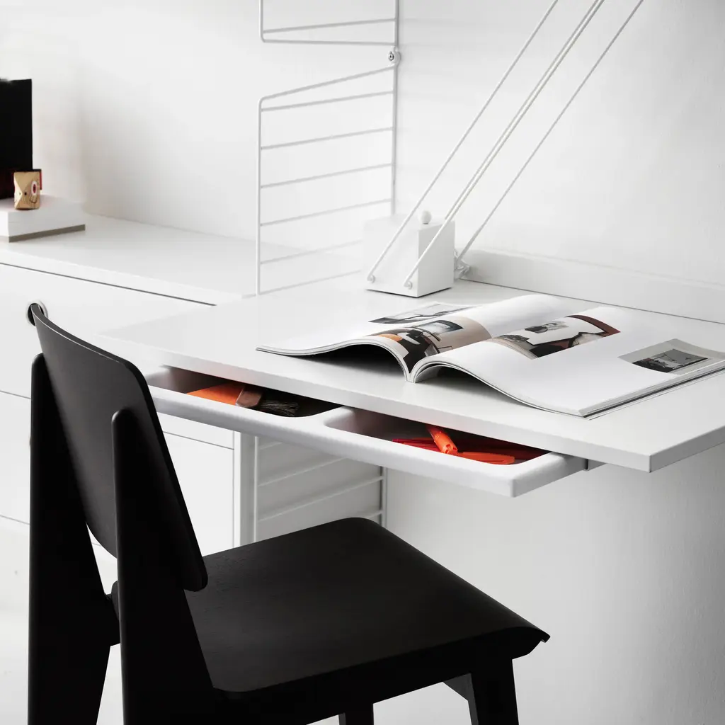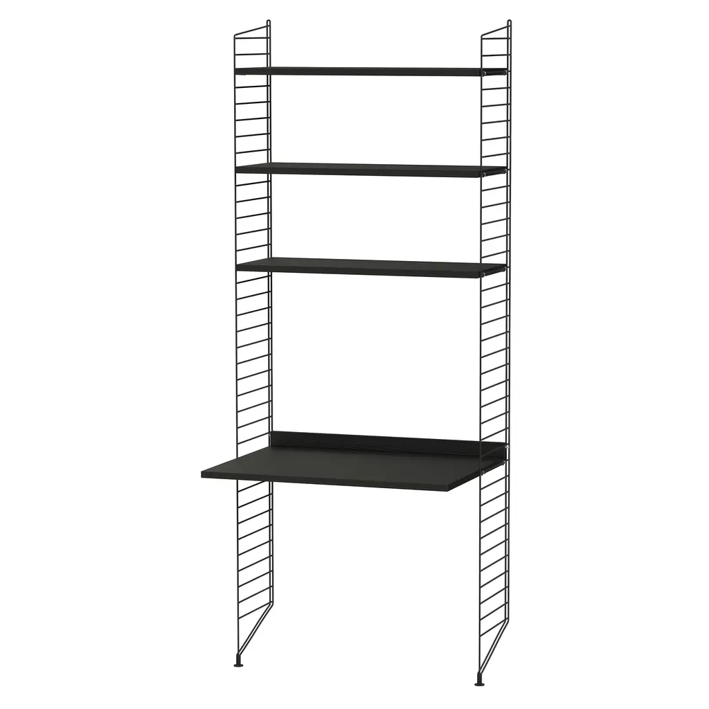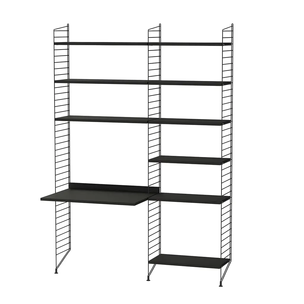 String doubles up in 2 floor-mounted bays with multiple shelves and an expanded desktop in this pre-selected composition for a home or office workspace. With storage for books or other record-keeping above, it also provides additional shelves within easy reach of the desktop. Available in woodgrain veneer or painted finishes with the signature coated-wire frame, String's bundles are also infinitely expandable for future needs, as generations of devotees have discovered since the 1949 debut of Nisse Strinning's innovative system.