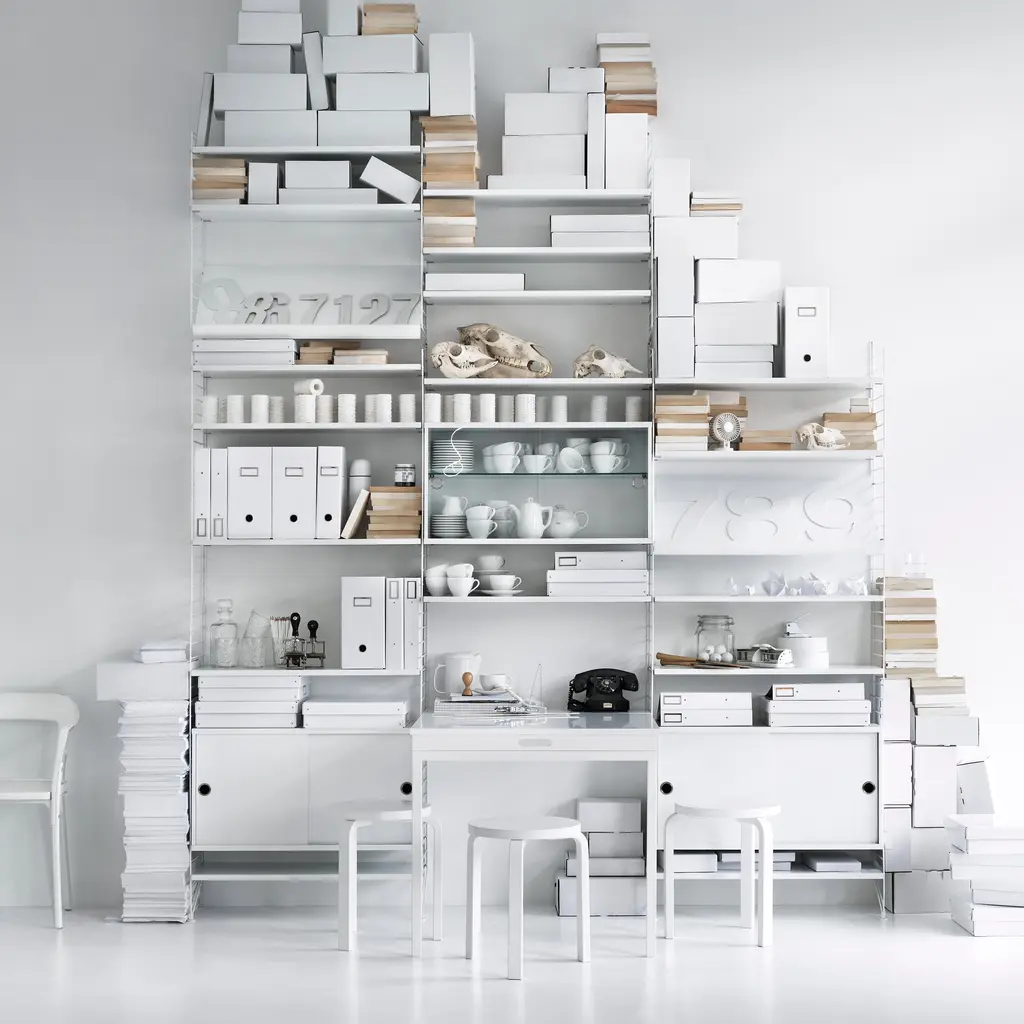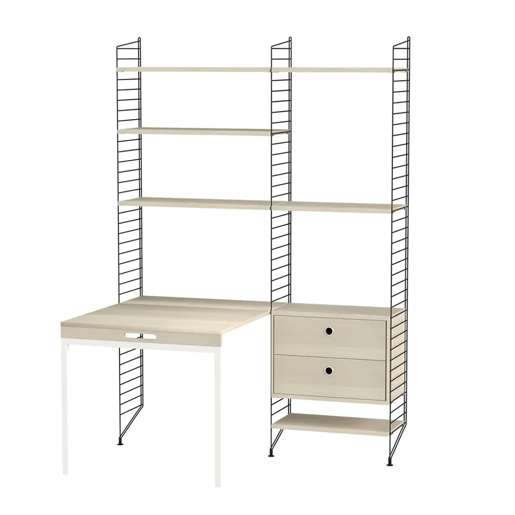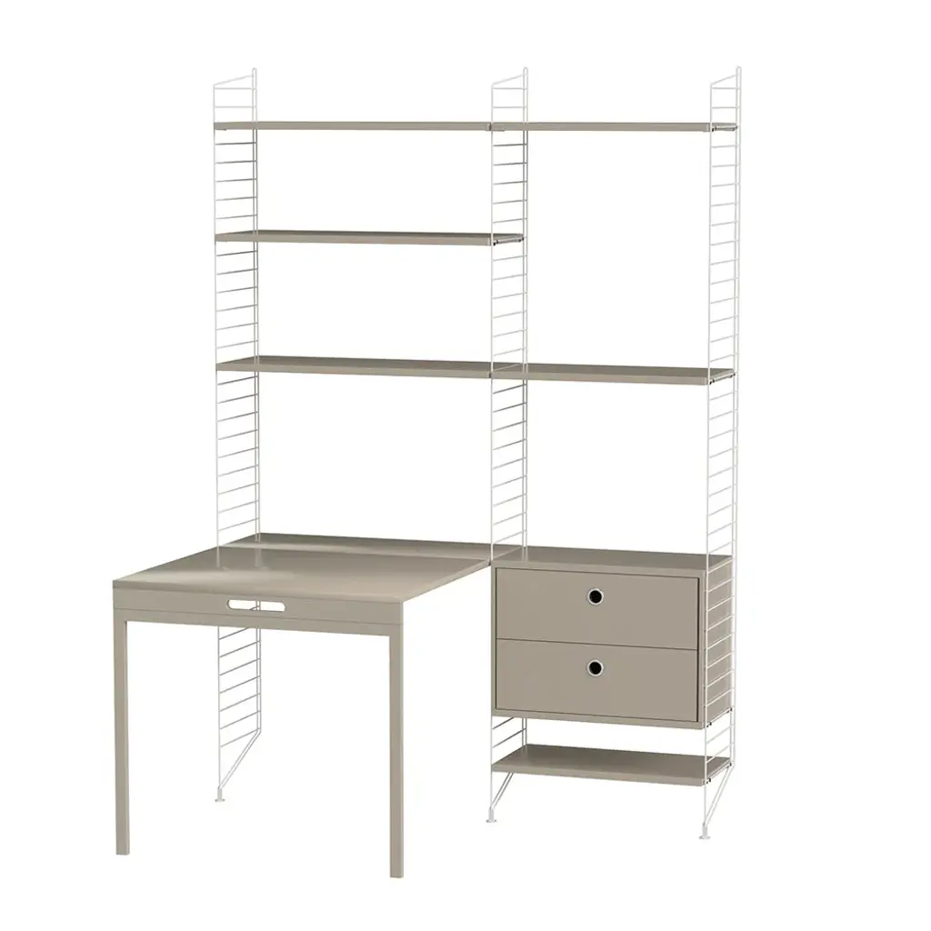 This pre-configured String unit offers the welcome opportunity to camouflage a home or office workspace. Along with the fold-down desk and a pair of clutter-concealing drawers, the double-bay coated wire frame also includes additional open shelving. Like all of String's select combinations, it’s compatible with all the elements of Nisse Strinning’s innovative system and can be readily expanded as needs dictate.