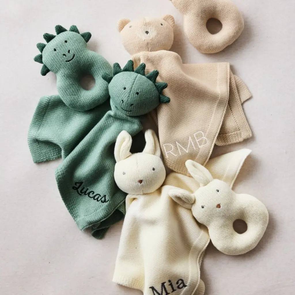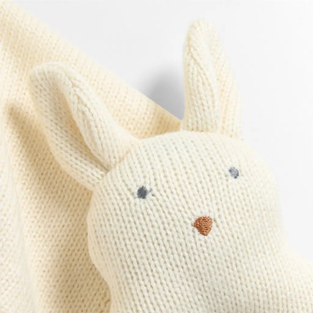 Our hopping-cute bunny lovey and rattle are always ready for snuggle time. The soothing set is made from knitted acrylic that's as supersoft as it is durable. Both lovey and rattle feature perky ears and sweet embroidered touchesand the lovey can be personalized with a child's name (perfect for gifting). Bonus points for parents: they're machine-washable.