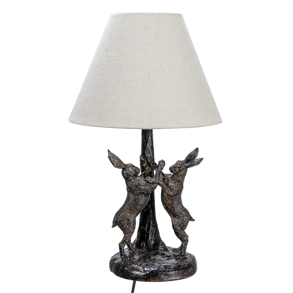 Add a touch of whimsy and charm to any living space with this playfully designed table lamp. This adorable lamp features a resin base crafted in the shape of bunny rabbits, finished in warm brown tones. Topped with a natural linen empire shade, it radiates a soft and warm glow that will fill any space with cozy ambiance. Measuring 11 inches in diameter and 18.5 inches in height, this table lamp is the perfect size for showcasing as the centerpiece of a spring-themed display or adding a touch of cottage-inspired charm to any interior design scheme. Made from durable resin and linen, this piece is both sturdy and long-lasting. Features: