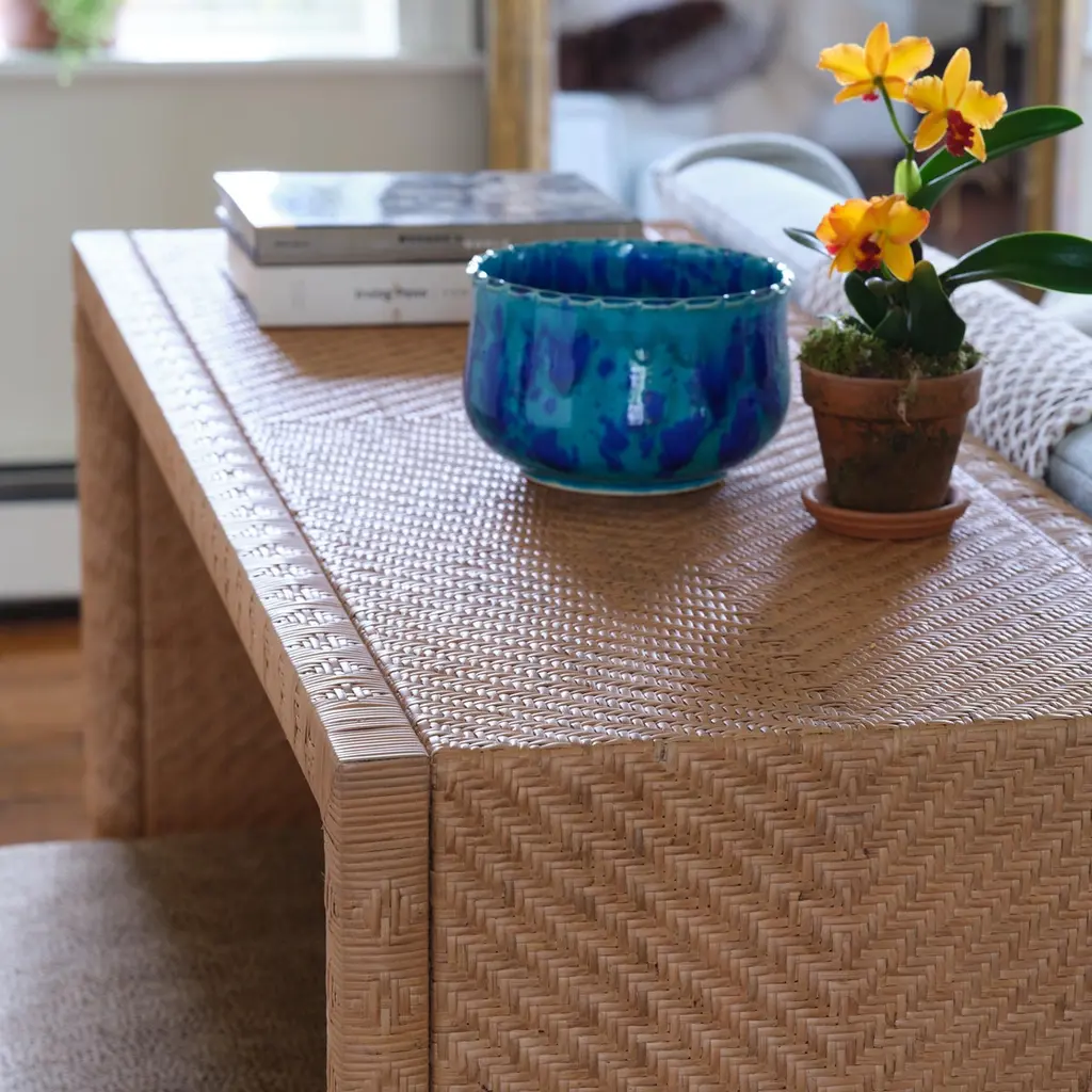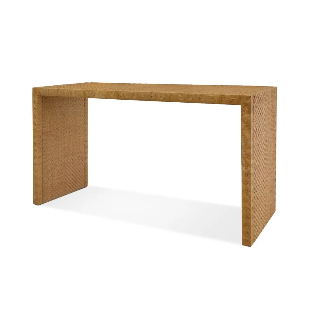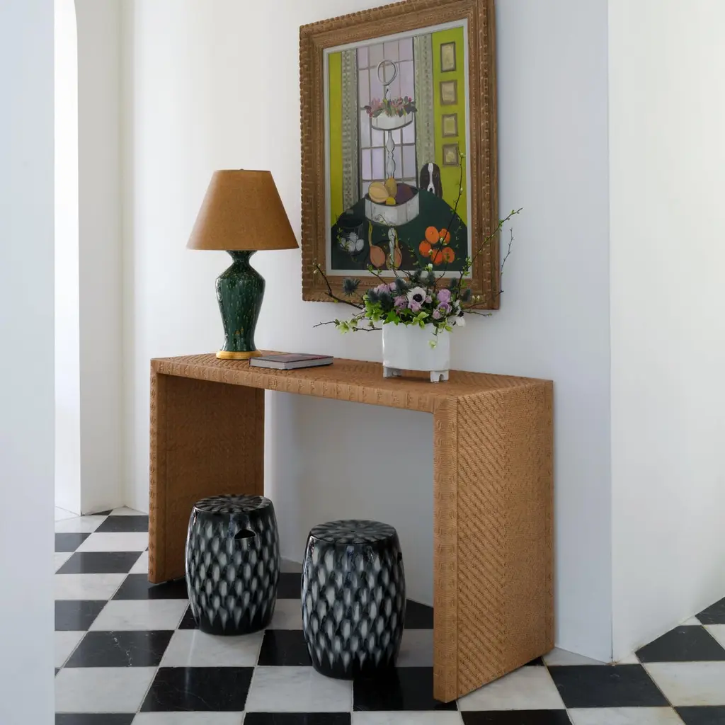 A classic waterfall-shaped console, a favorite for its simplicity, is given extra visual interest with a beautifully wrapped frame, with fields of large diamonds framed by smaller bands of diamond blocks at the frame corners. Perfect with extra stools tucked underneath for seating in a living room (or a dog-bed in a hallway).