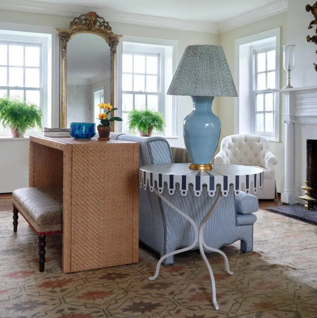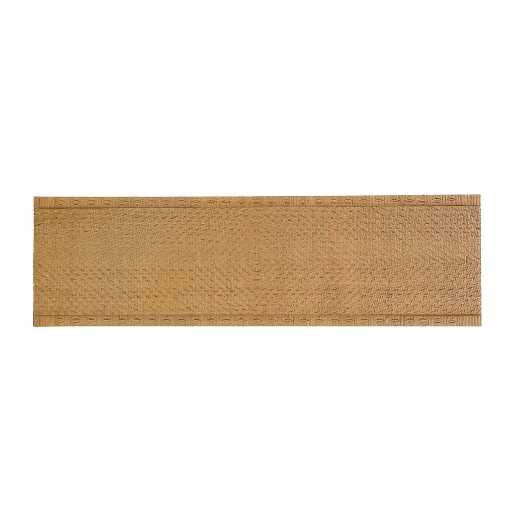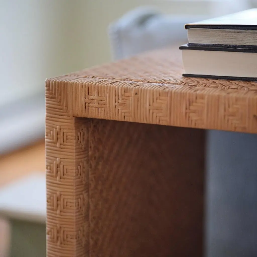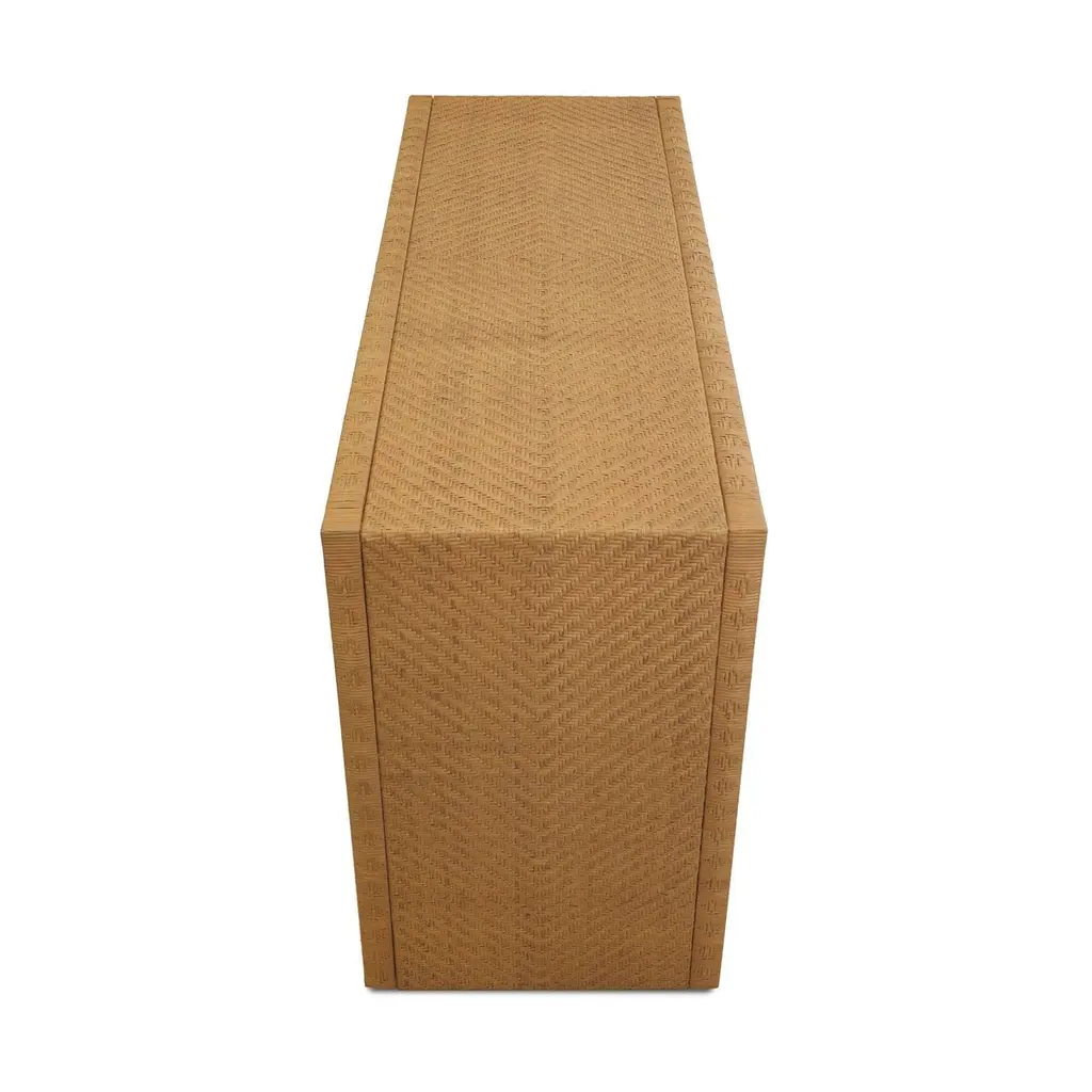 A classic waterfall-shaped console, a favorite for its simplicity, is given extra visual interest with a beautifully wrapped frame, with fields of large diamonds framed by smaller bands of diamond blocks at the frame corners. Perfect with extra stools tucked underneath for seating in a living room (or a dog-bed in a hallway).