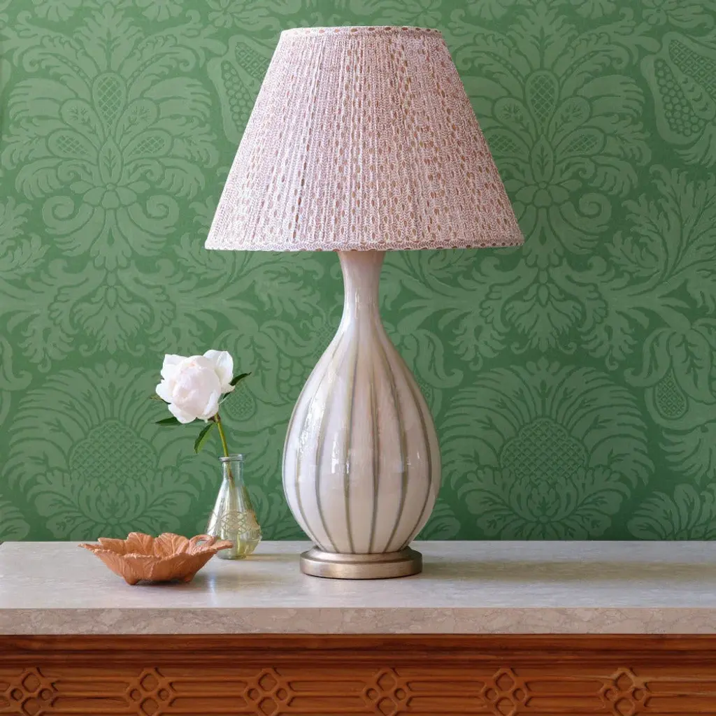 Crafted from hand block printed fabric, this lampshade features a stylized vine print with warm brown floral buds. Scaled to work on nearly all of the Bunny Williams Home table lamps.