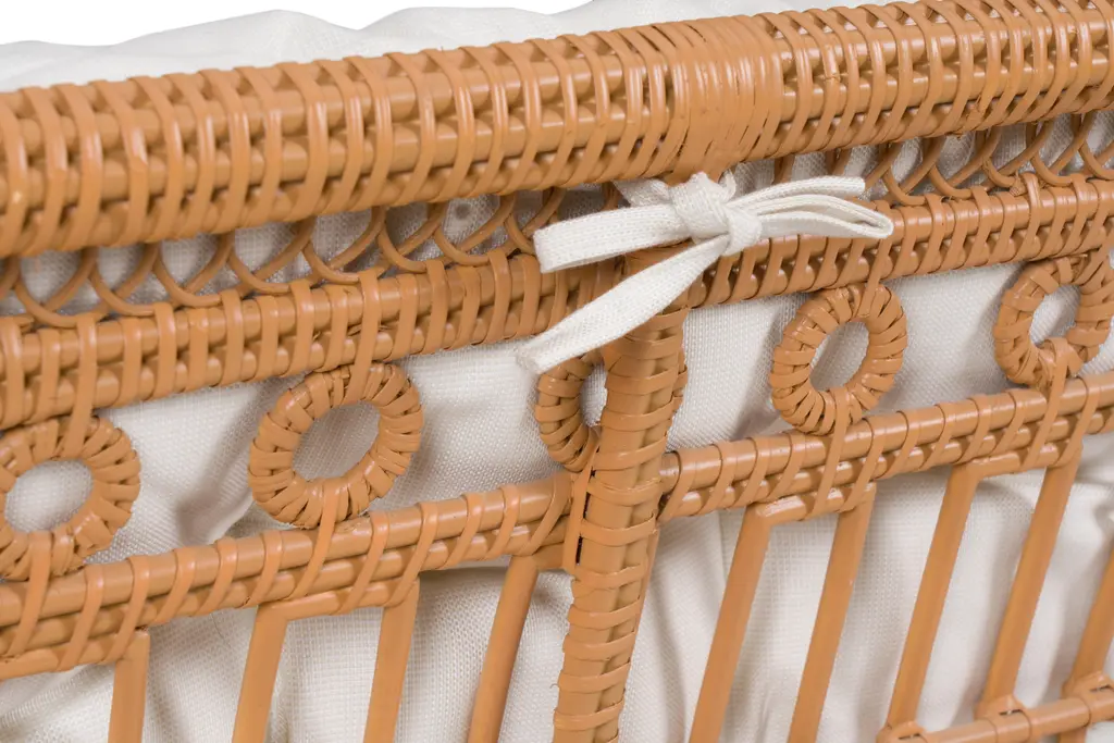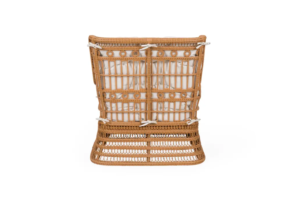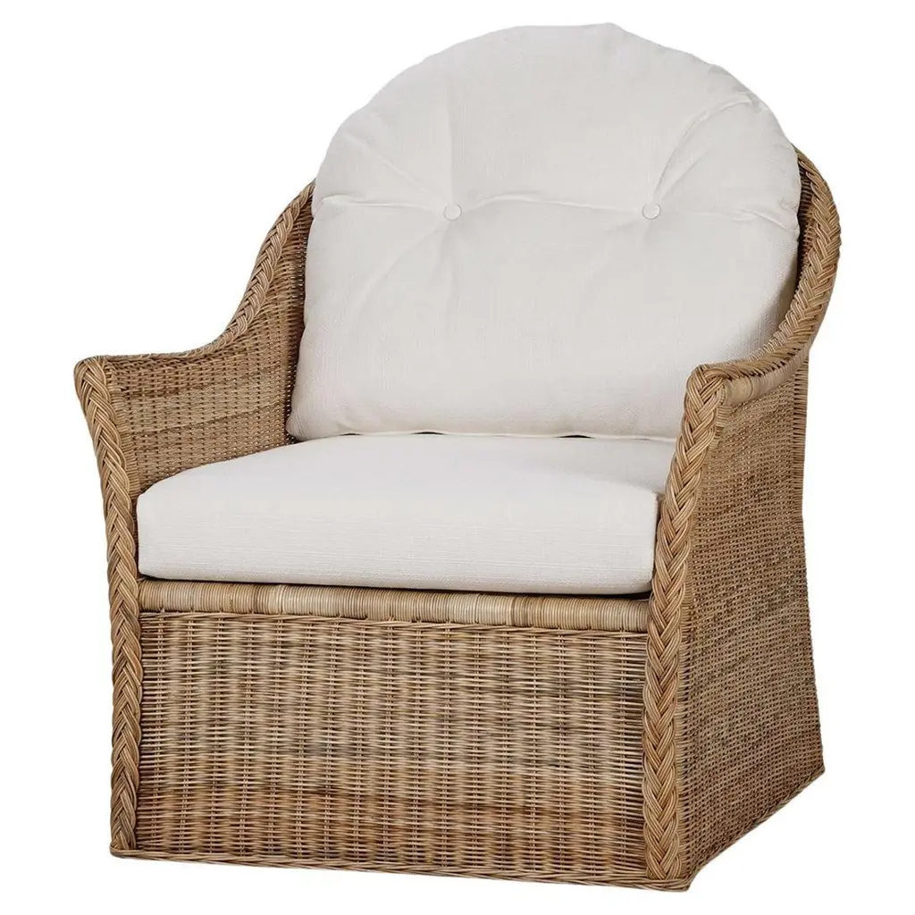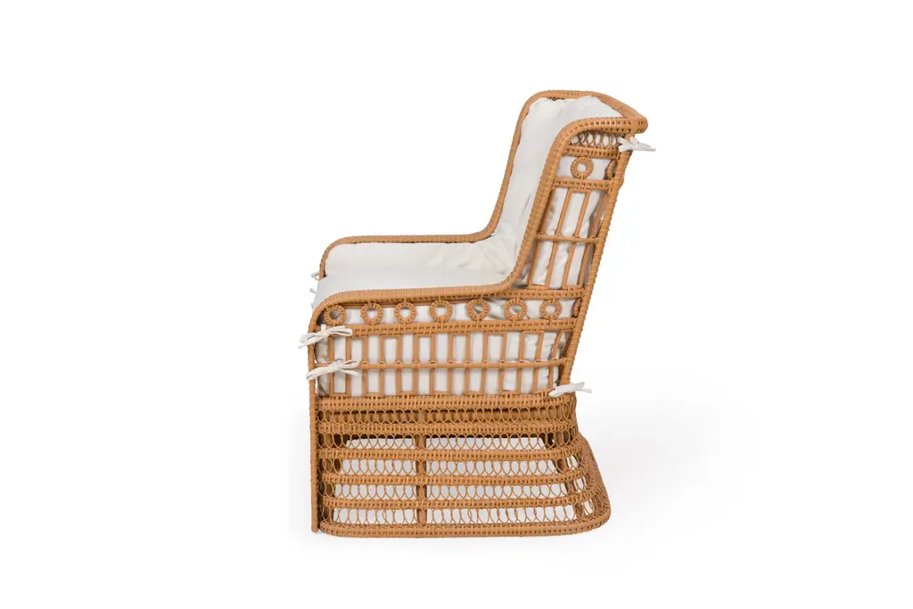 The Kinley Armchair is comfortably upholstered with tie-on seat and back cushions. - Natural rattan is suitable for use indoors or on a covered loggia, porch, or veranda. - Seat and back cushions are not available separately and come ready-to-ship with frames. - Cushions are currently offered in Sunbrella Natte Nature fabric only. Not available in COM. Overall dimensions: 33" W x 30"D x 37"H Seat height: 18.25" to top of cushion Arm height: 22.25" at lowest point of slope Seat: 31"W exterior, 24.5"W interior, 21"D